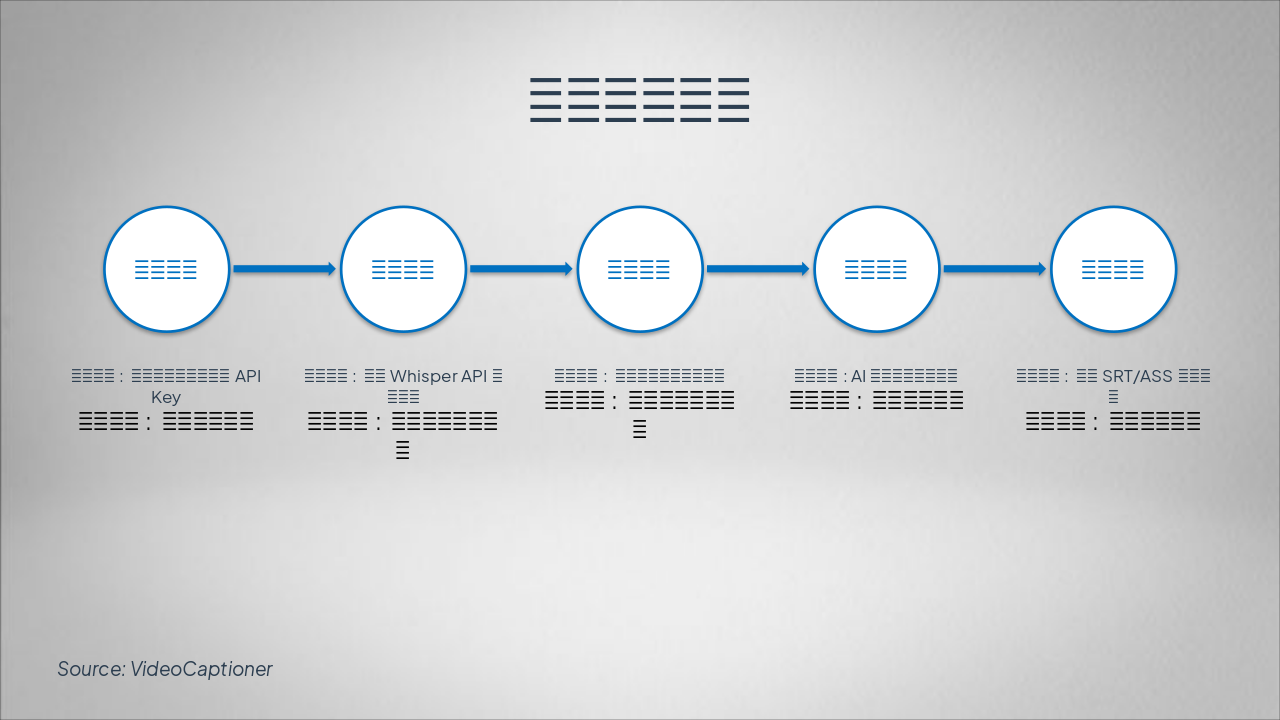 { "headers": [ "步骤", "主要操作", "预期输出" ], "rows": [ [ "上传视频", "选择视频文件,输入API Key", "视频加载就绪" ], [ "语音识别", "调用Whisper API转录语音", "原始文本转录完成" ], [ "生成字幕", "断句优化,添加时间戳", "初始中文字幕生成" ], [ "翻译字幕", "AI多语言翻译与润色", "优化翻译字幕" ], [ "导出字幕", "选择SRT/ASS格式导出", "字幕文件下载" ] ] }