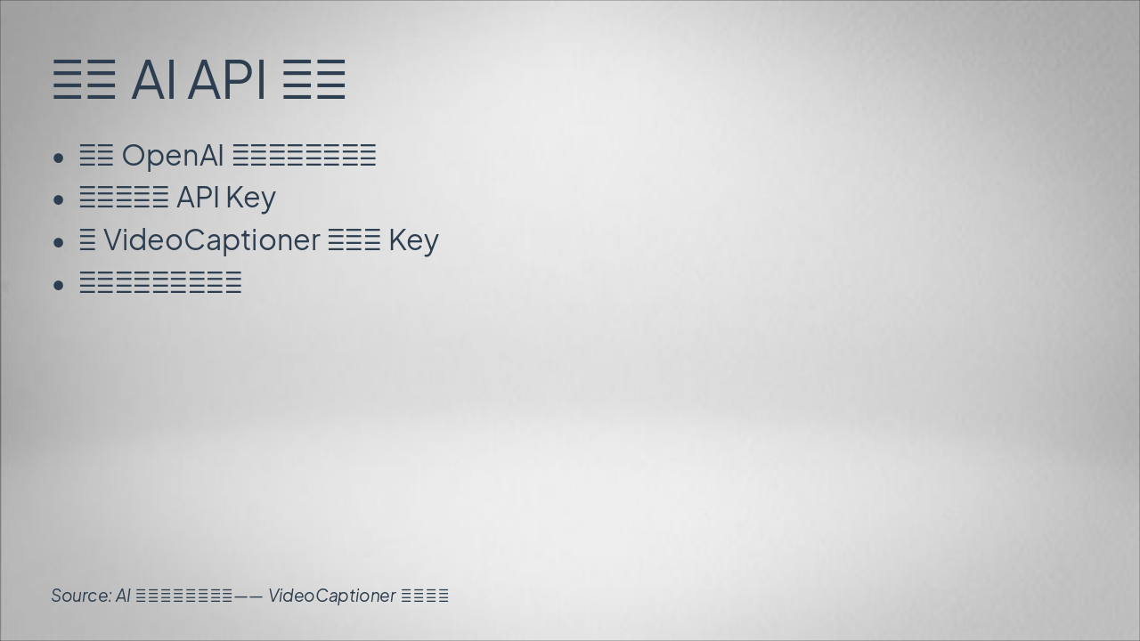 主题:AI赋能视频字幕工具——VideoCaptioner实用指南(简洁科技风,中文PPT) 内容大纲: 1. 封面:AI赋能视频字幕工具——VideoCaptioner实用指南 2. 介绍VideoCaptioner:自动识别语音、生成字幕、优化翻译、多语言支持 3. AI核心技术:语音识别(Whisper API)、断句优化、字幕翻译 4. 大学生痛点:外语无字幕视频难理解,AI自动生成中文字幕 5. 获取AI API方法:注册OpenAI账号、创建API Key、配置工具 6. 使用Whisper API语音识别步骤:填写Key、选择模型、上传视频 7. 实际使用流程:视频→识别→生成→翻译→导出字幕 8. 前后对比:传统字幕方式 vs AI自动方式 9. 核心优势总结:智能字幕、多语言支持、学习提效 10. 总结与Q&A:AI助力学习,看懂无字幕视频更轻松