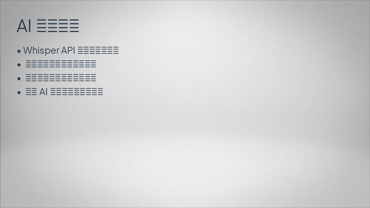The slide "AI Core Technologies" highlights the Whisper API for precise speech recognition. It features intelligent sentence optimization for better fluency, automatic multi-language subtitle translation, and powerful AI for accuracy and efficiency.