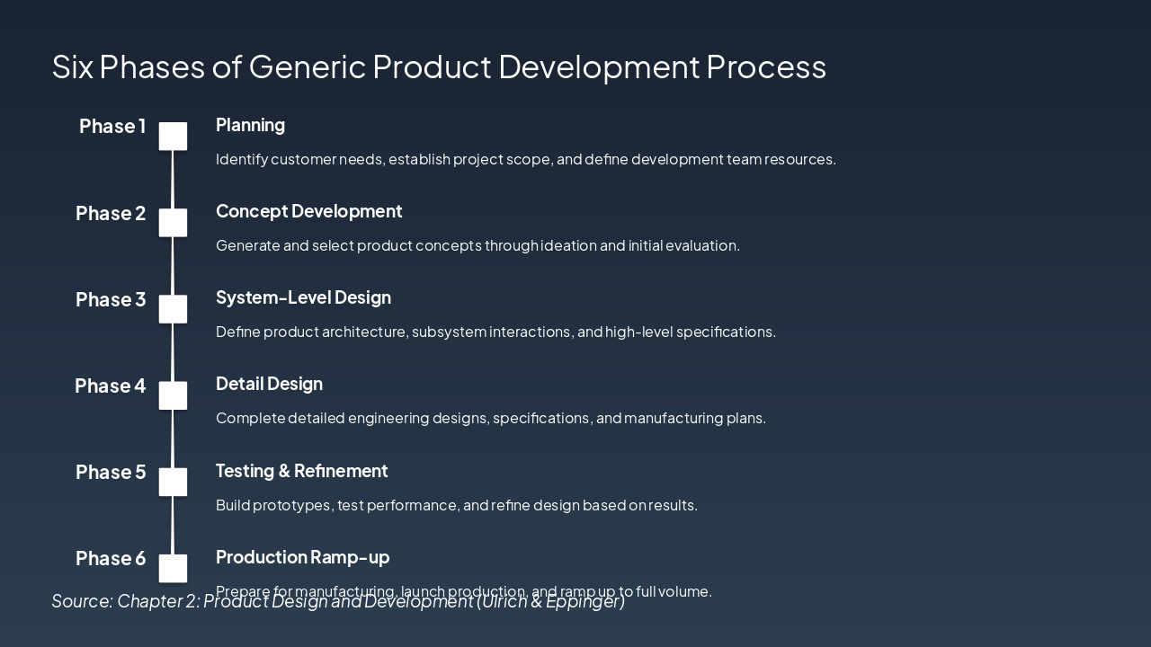 Phase 1: Planning Identify customer needs, establish project scope, and define development team resources. Phase 2: Concept Development Generate and select product concepts through ideation and initial evaluation. Phase 3: System-Level Design Define product architecture, subsystem interactions, and high-level specifications. Phase 4: Detail Design Complete detailed engineering designs, specifications, and manufacturing plans. Phase 5: Testing & Refinement Build prototypes, test performance, and refine design based on results. Phase 6: Production Ramp-up Prepare for manufacturing, launch production, and ramp up to full volume.