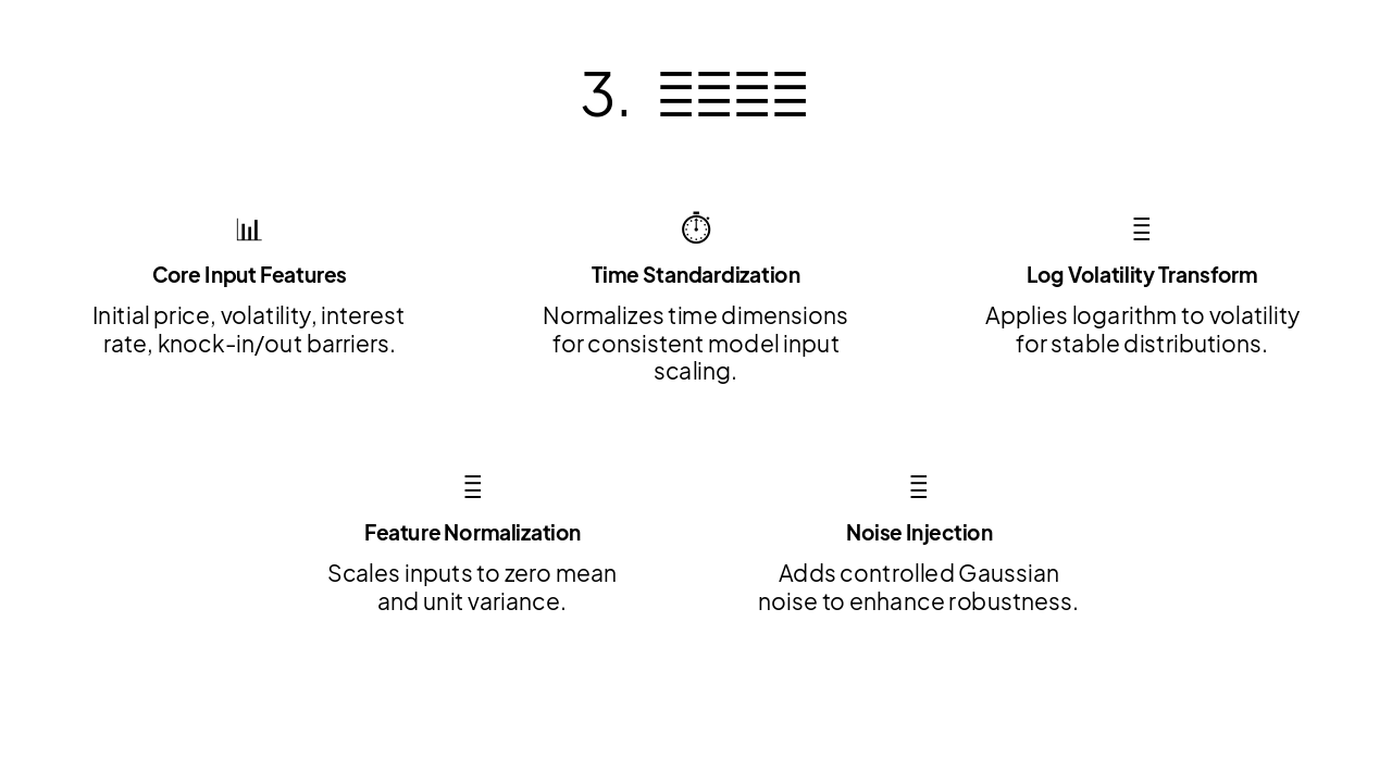 { "features": [ { "icon": "📊", "heading": "Core Input Features", "description": "Initial price, volatility, interest rate, knock-in/out barriers." }, { "icon": "⏱️", "heading": "Time Standardization", "description": "Normalizes time dimensions for consistent model input scaling." }, { "icon": "🔢", "heading": "Log Volatility Transform", "description": "Applies logarithm to volatility for stable distributions." }, { "icon": "📏", "heading": "Feature Normalization", "description": "Scales inputs to zero mean and unit variance." }, { "icon": "🎲", "heading": "Noise Injection", "description": "Adds controlled Gaussian noise to enhance robustness." } ] }