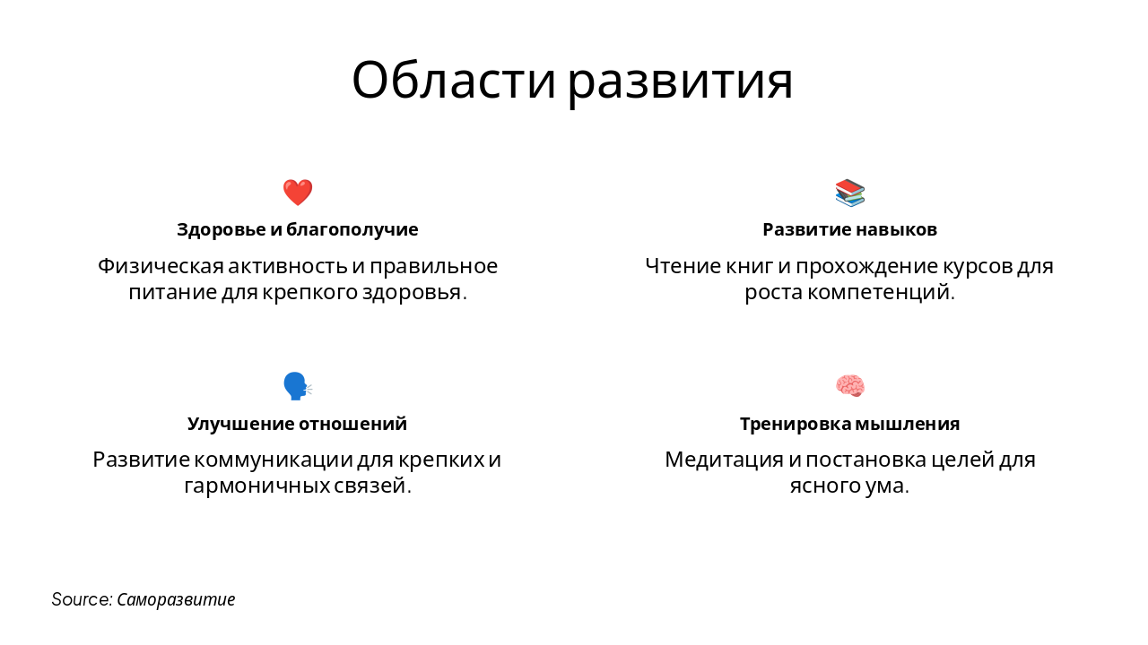 Слайд "Области развития" представляет ключевые сферы личностного роста в формате сетки функций. Он включает здоровье и благополучие через активность и питание, развитие навыков с помощью чтения и курсов, улучшение отношений за счет коммуникации, а также тренировку мышления посредством медитации и постановки целей.