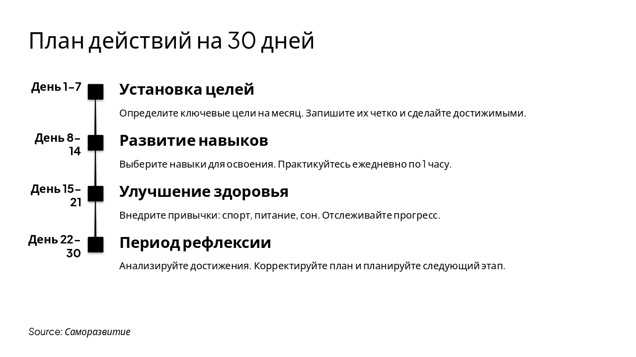 План действий на 30 дней разделён на четыре этапа: дни 1-7 — установка чётких и достижимых целей; дни 8-14 — ежедневная практика навыков по 1 часу. Дни 15-21 посвящены улучшению здоровья через спорт, питание и сон с отслеживанием прогресса, а дни 22-30 — рефлексии, анализу достижений и корректировке плана.