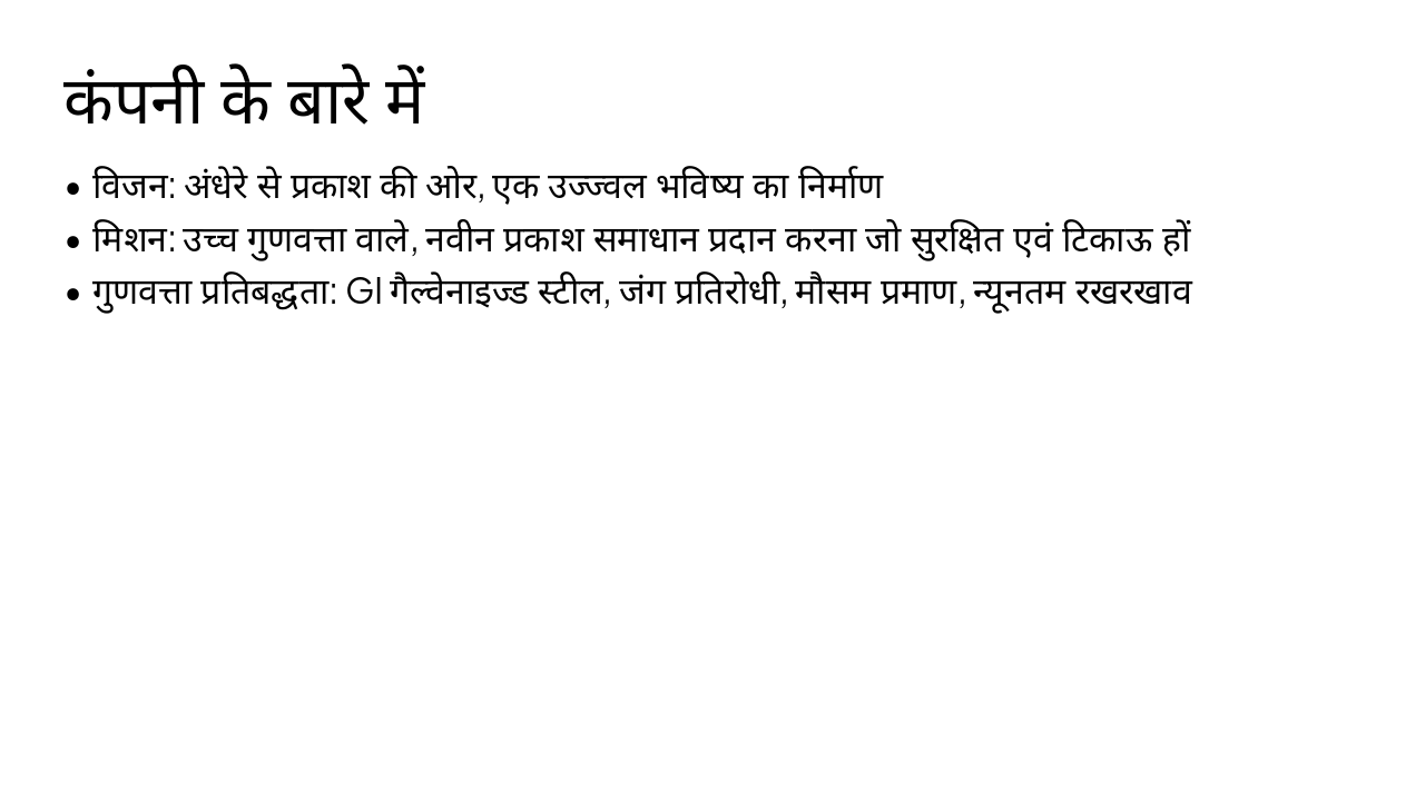Create a professional enhanced Hindi presentation for YOHA Enterprises with strong modern design and improved content formatting. Slides: 1. Cover Slide – YOHA Enterprises | अंधेरे से प्रकाश की ओर | Professional background with lighting theme. 2. About Company – Vision, Mission, Quality Commitment. 3. High Mast Pole Details – 10 meter height, 6 x 150W flood lights, GI galvanized steel, rust resistant, weather proof, low maintenance, cost effective. 4. Need of Street Lights – Safety, accident reduction, crime control, women & children safety, village development. 5. What is Street Light – Definition and benefits. 6. Types – LED Street Light, Solar Street Light, High Mast Light (comparison layout). 7. Project Highlight – Sanjeet Nagar installation (10 high mast poles, Diwali inauguration, city illuminated). 8. Community Benefits – Security, identity, beautification, energy efficiency. 9. Thank You Slide – Contact section placeholder. Use clean layout, icons, professional fonts, structured bullet points.