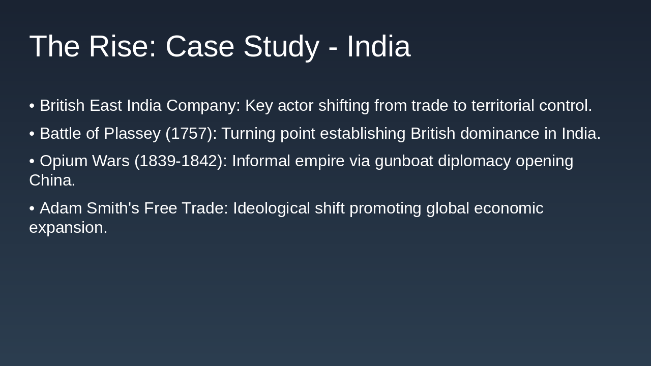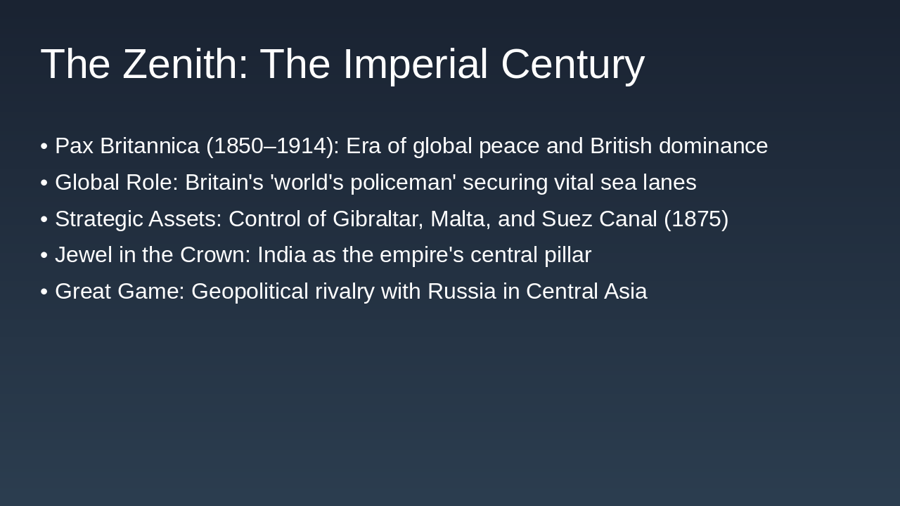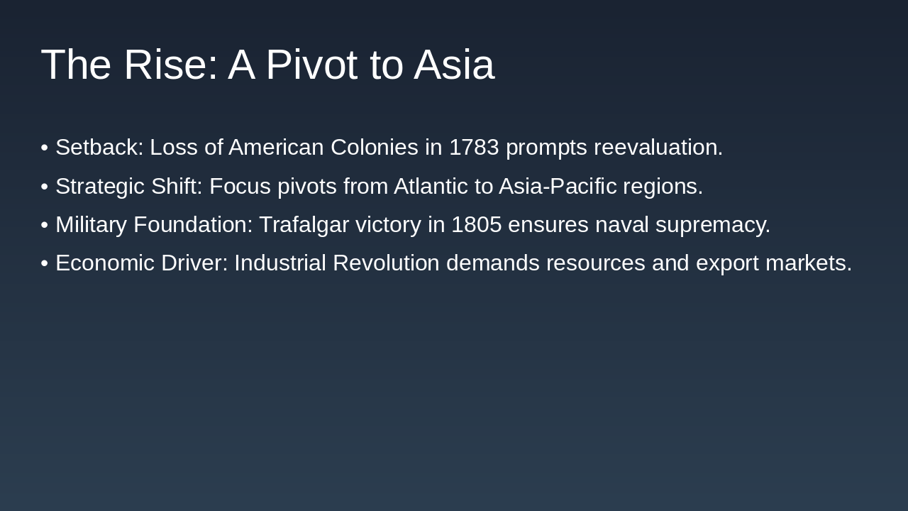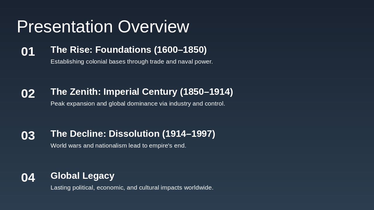 Rise: Naval power, industry, governance. Fall: War costs, nationalism. Legacy: Institutions, interconnectedness, conflicts. Relevance: Key to modern world.