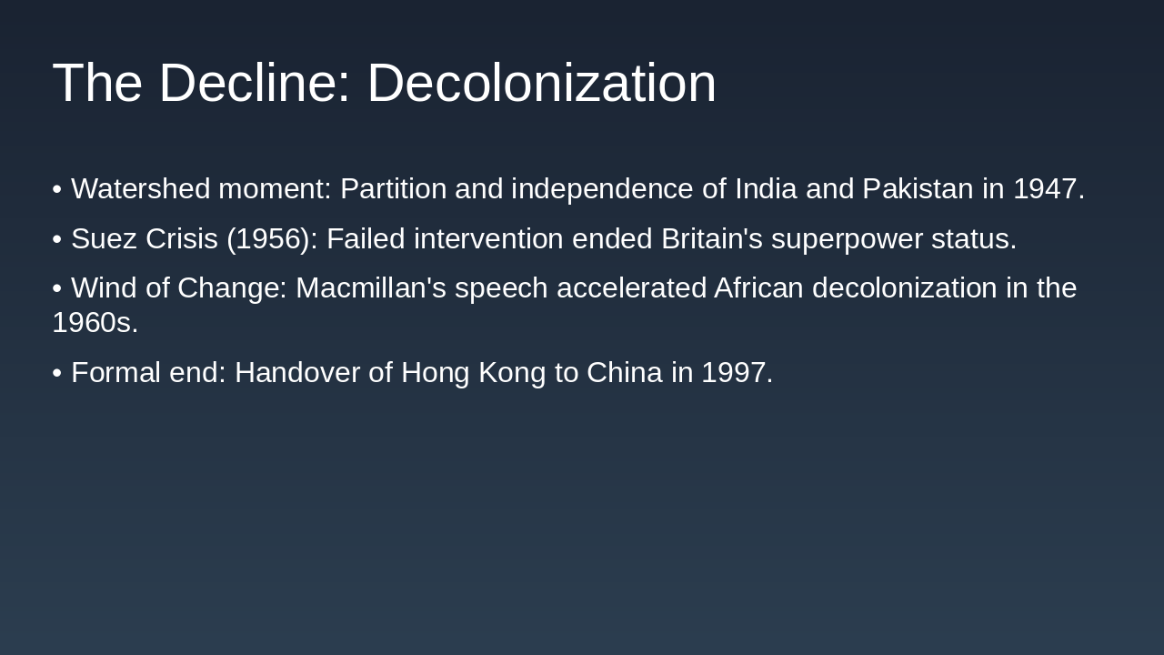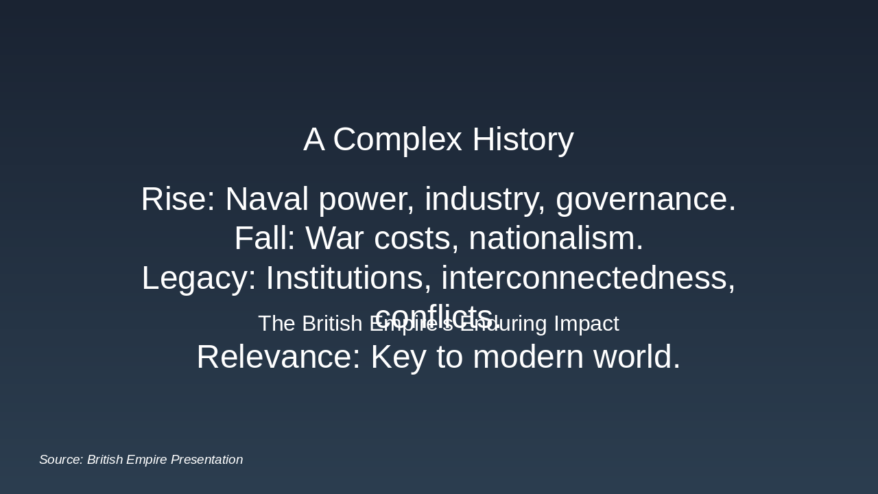 The British Empire's complex history featured a rise driven by naval power, industry, and governance, followed by a fall due to war costs and rising nationalism. Its enduring legacy includes influential institutions, global interconnectedness, ongoing conflicts, and relevance to understanding the modern world.