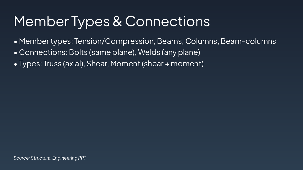 This title slide introduces the "CE470 – Structural Steel Design" course, focusing on the design of steel structures. It covers topics like structural members, connections, loads, and design methods, with the objective of understanding the systematic process of structural design.
