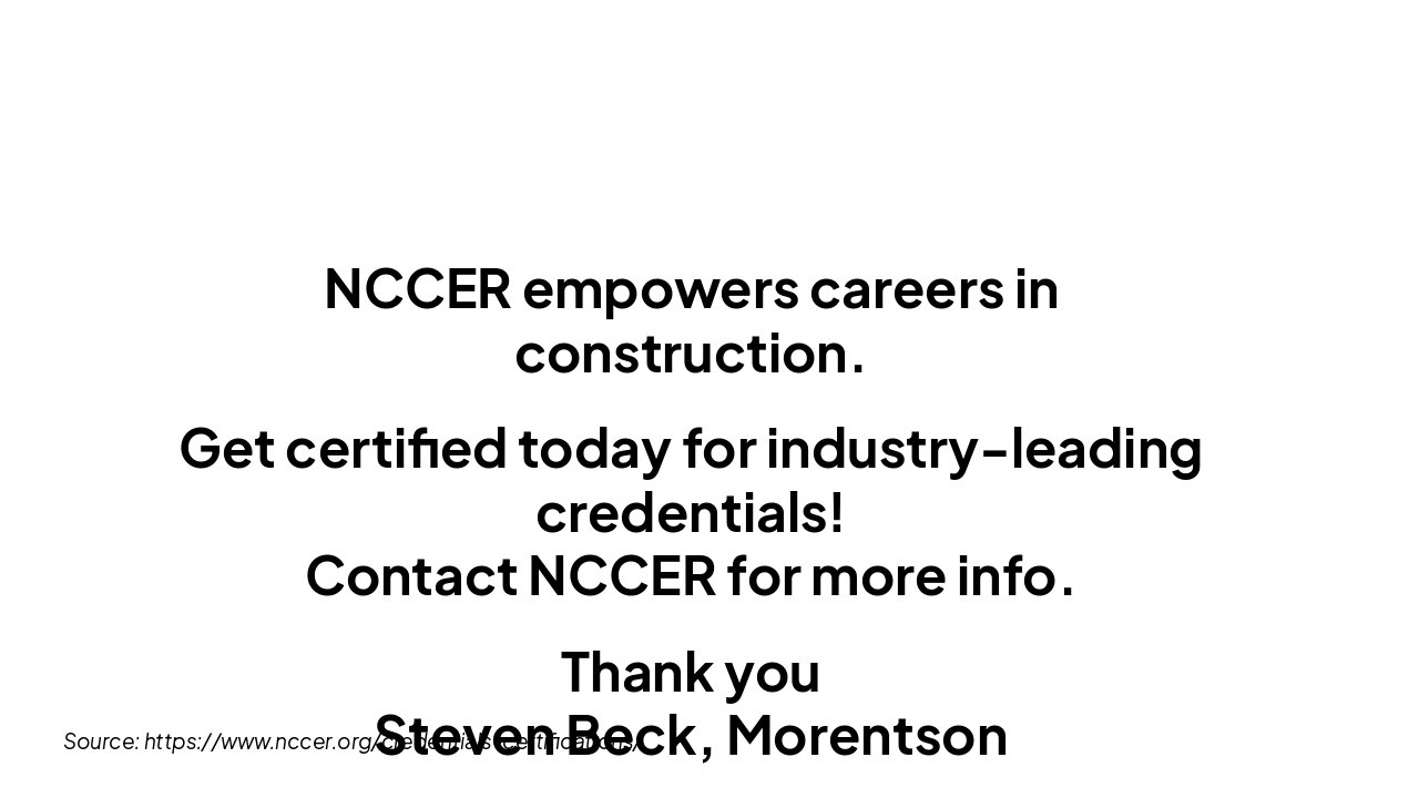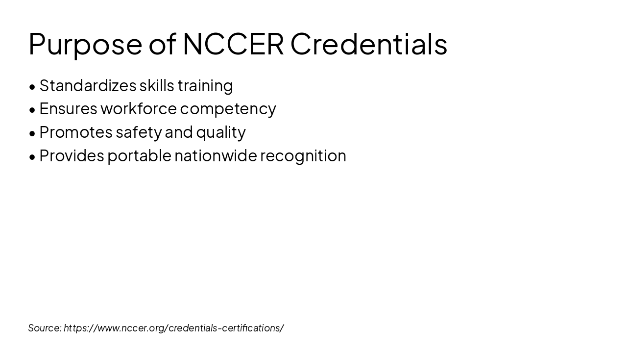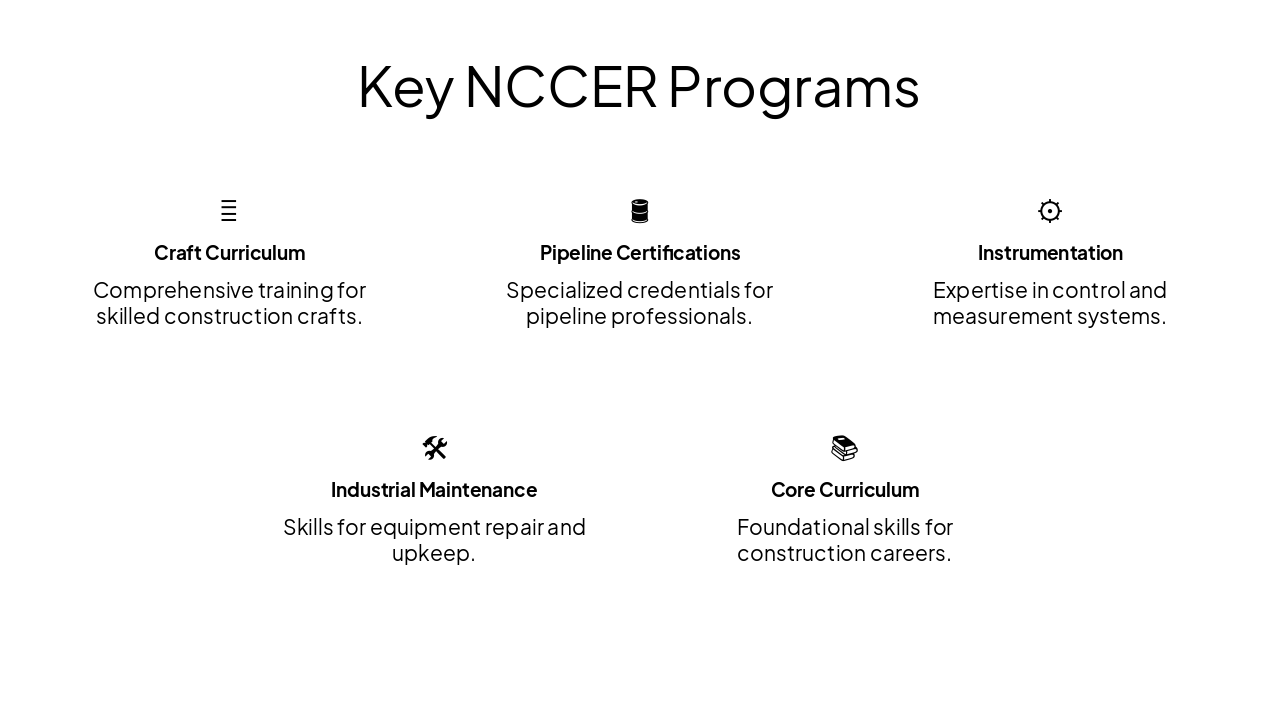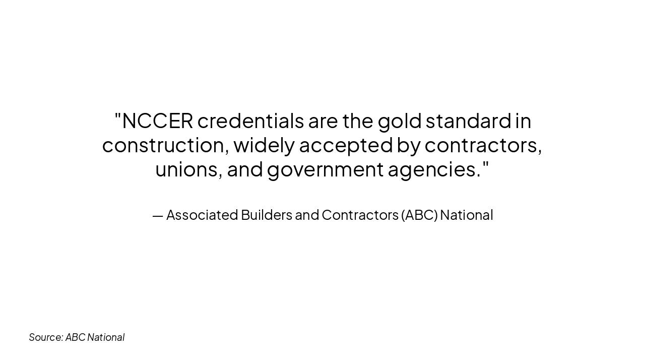 { "headers": [ "Step", "Action", "Details" ], "rows": [ [ "1. Complete Training", "Finish required NCCER training modules", "Varies by craft and level" ], [ "2. Pass Assessments", "Achieve passing scores on written and performance tests", "Administered by accredited sponsors" ], [ "3. Earn Credential", "Receive wallet card, transcript, and digital badge", "Valid for 4 years" ], [ "4. Recertify Every 4 Years", "Retake and pass assessments", "Maintain active credential status" ], [ "5. Update Digital Badge", "Download updated Credly badge post-recertification", "Shareable on LinkedIn and resumes" ] ] }