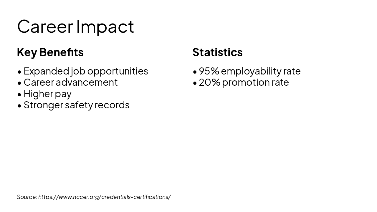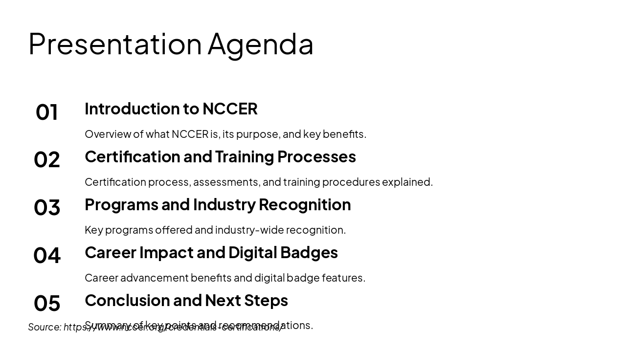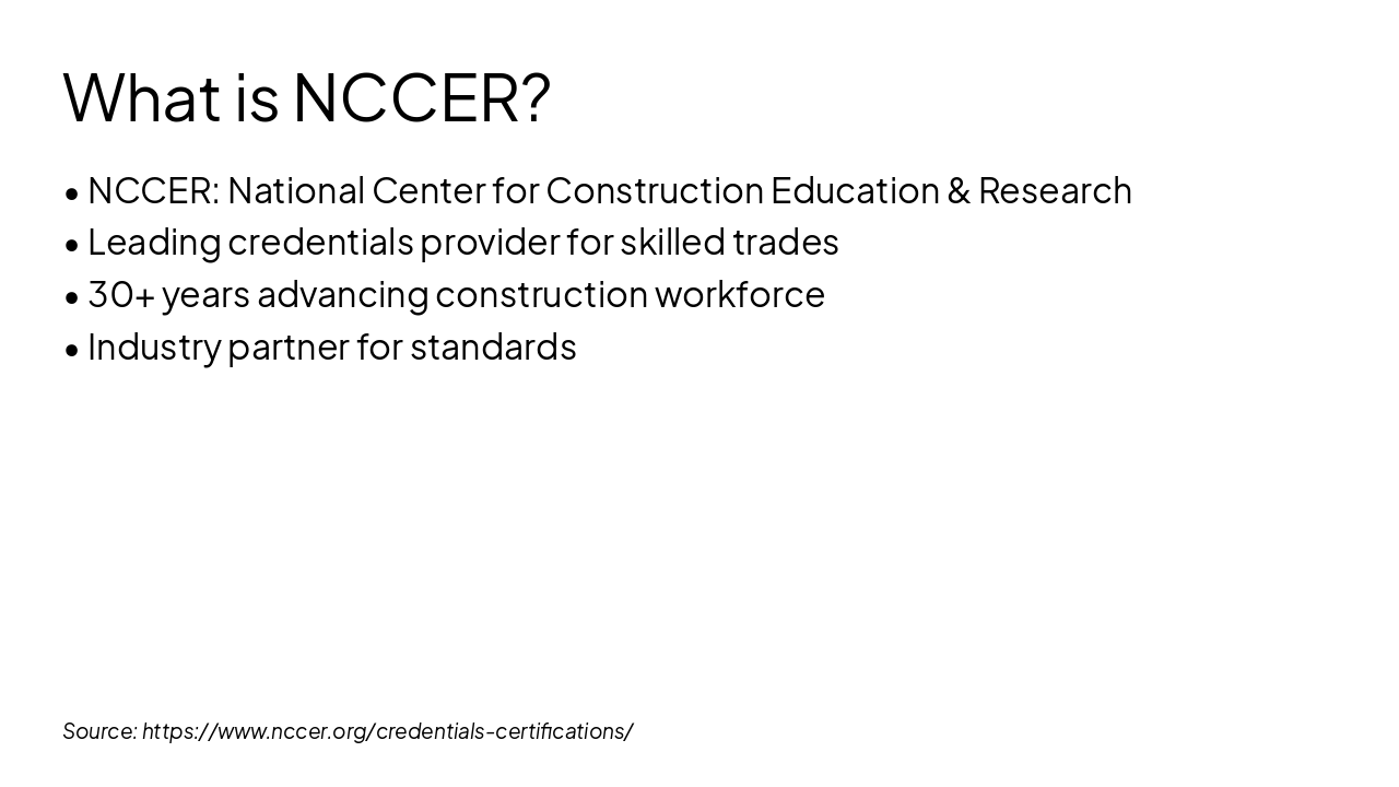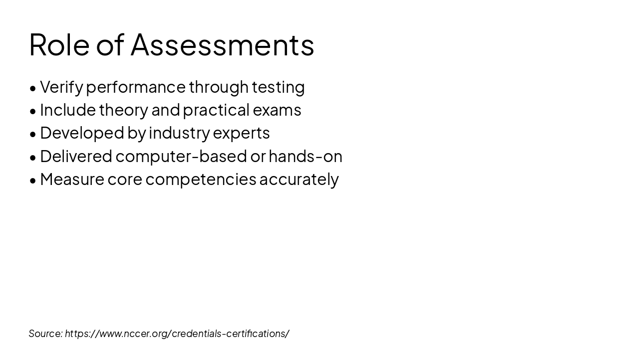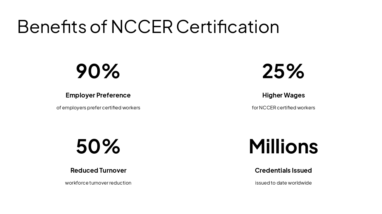 { "headers": [ "Step", "Action", "Details" ], "rows": [ [ "1. Complete Training", "Finish required NCCER training modules", "Varies by craft and level" ], [ "2. Pass Assessments", "Achieve passing scores on written and performance tests", "Administered by accredited sponsors" ], [ "3. Earn Credential", "Receive wallet card, transcript, and digital badge", "Valid for 4 years" ], [ "4. Recertify Every 4 Years", "Retake and pass assessments", "Maintain active credential status" ], [ "5. Update Digital Badge", "Download updated Credly badge post-recertification", "Shareable on LinkedIn and resumes" ] ] }