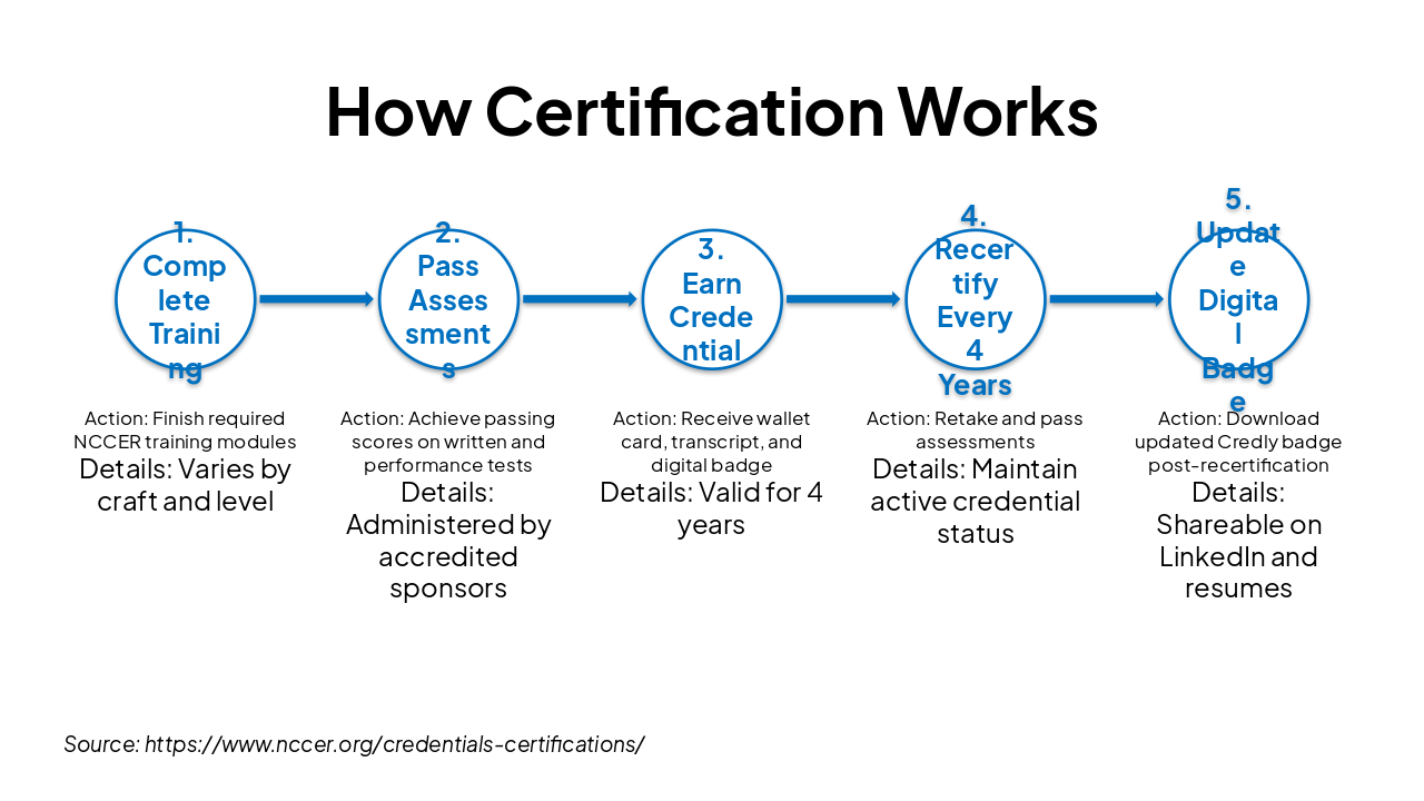 The NCCER certification workflow starts with completing craft-specific training, passing written and performance assessments via accredited sponsors, and earning a 4-year credential including a wallet card, transcript, and digital badge. Recertification every 4 years requires retaking and passing assessments, followed by downloading an updated, shareable Credly digital badge for LinkedIn and resumes.