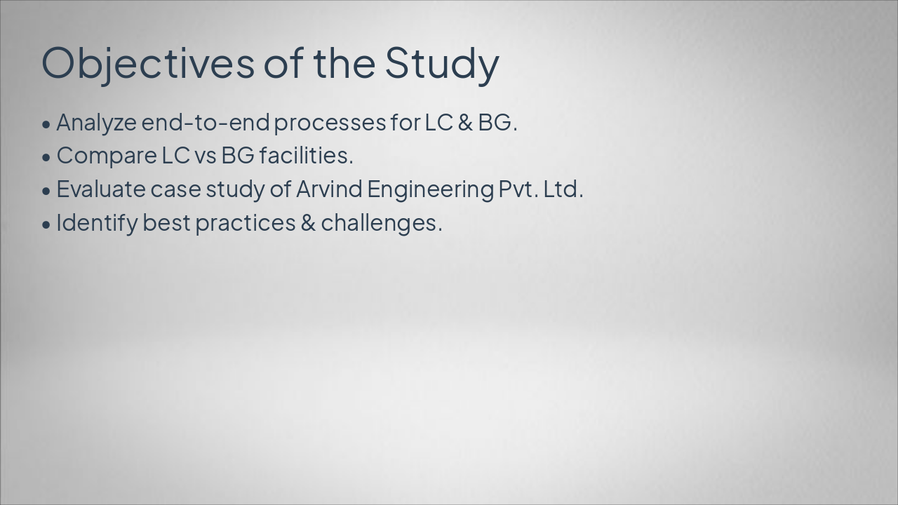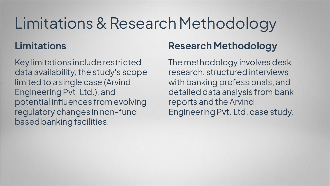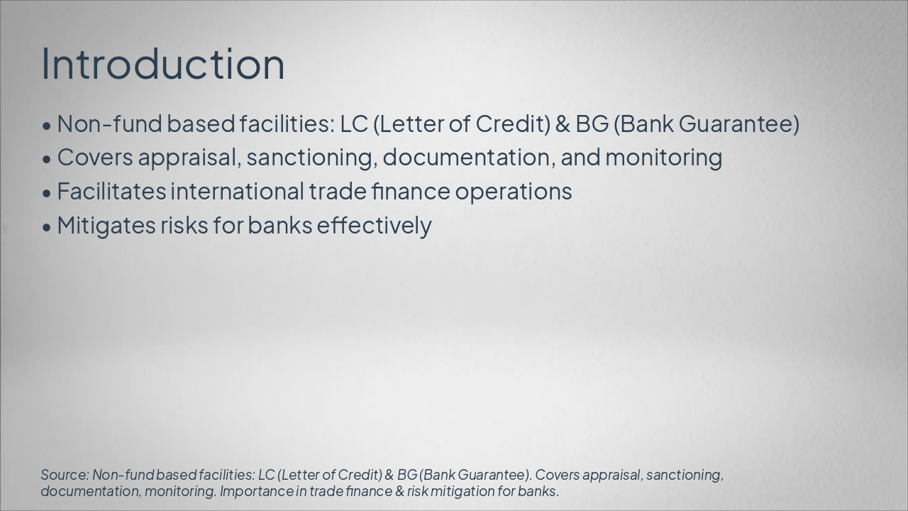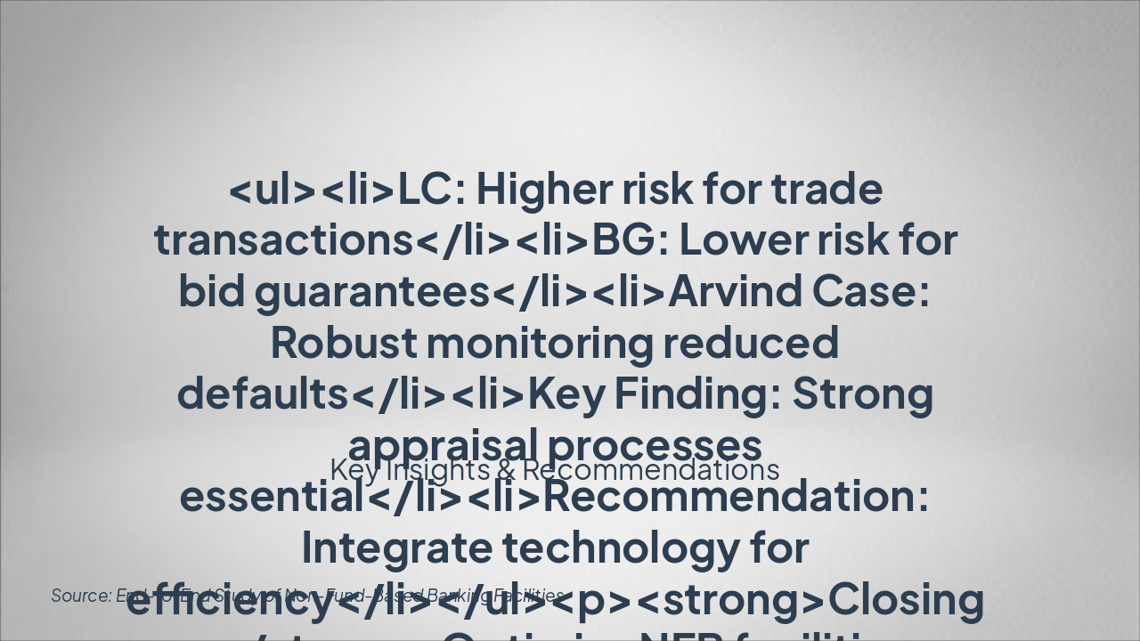 <ul><li>LC: Higher risk for trade transactions</li><li>BG: Lower risk for bid guarantees</li><li>Arvind Case: Robust monitoring reduced defaults</li><li>Key Finding: Strong appraisal processes essential</li><li>Recommendation: Integrate technology for efficiency</li></ul><p><strong>Closing:</strong> Optimize NFB facilities now.</p><p><em>CTA: Implement tech-driven monitoring today.</em></p>
