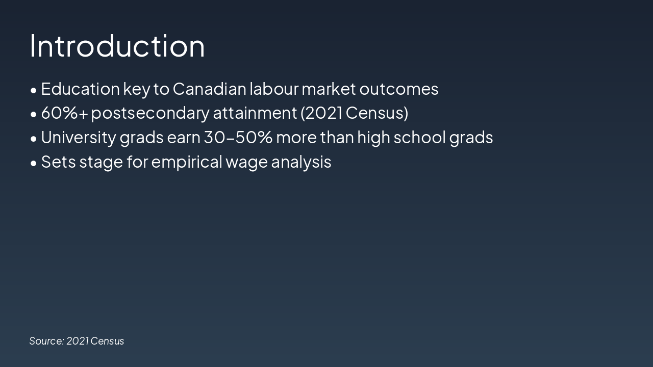 This title slide introduces a research study titled "The Impact of Education on Individual Wages in Canada: An Empirical Analysis Using Census Microdata of the year 2021." It includes attribution to the researcher [Your Name] and the date [Current Date].
