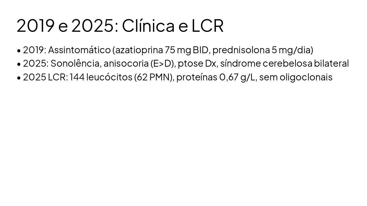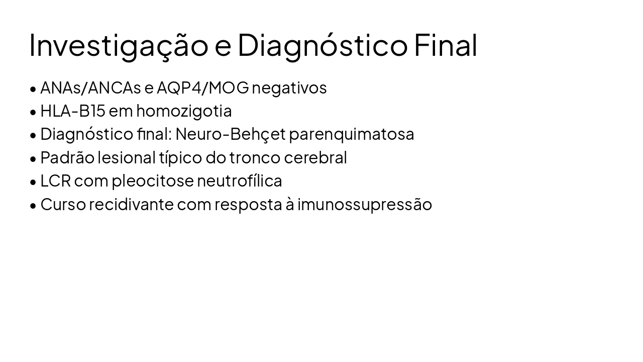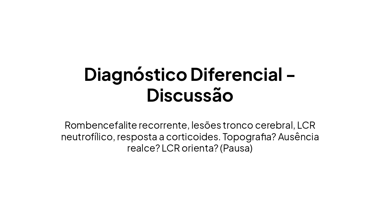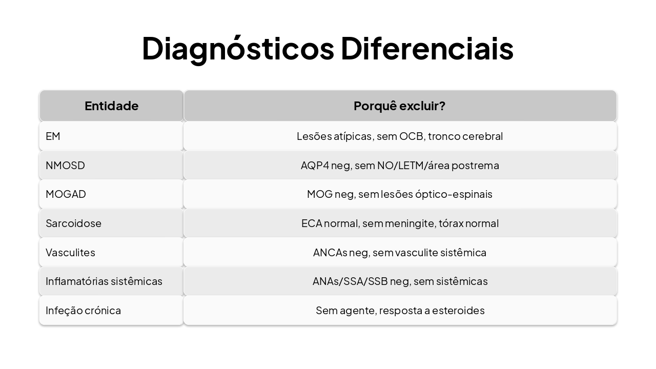 { "headers": [ "Entidade", "Porquê excluir?" ], "rows": [ [ "EM", "Lesões atípicas, sem OCB, tronco cerebral" ], [ "NMOSD", "AQP4 neg, sem NO/LETM/área postrema" ], [ "MOGAD", "MOG neg, sem lesões óptico-espinais" ], [ "Sarcoidose", "ECA normal, sem meningite, tórax normal" ], [ "Vasculites", "ANCAs neg, sem vasculite sistêmica" ], [ "Inflamatórias sistêmicas", "ANAs/SSA/SSB neg, sem sistêmicas" ], [ "Infeção crónica", "Sem agente, resposta a esteroides" ] ] }