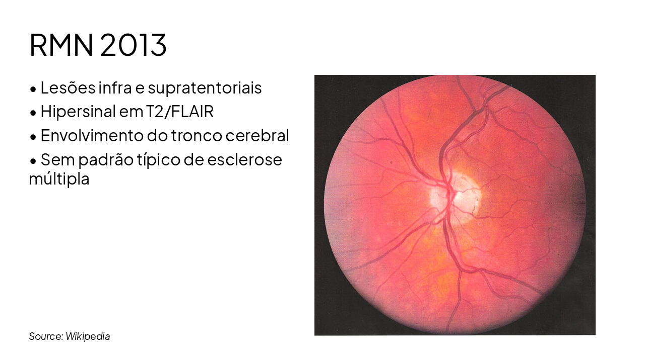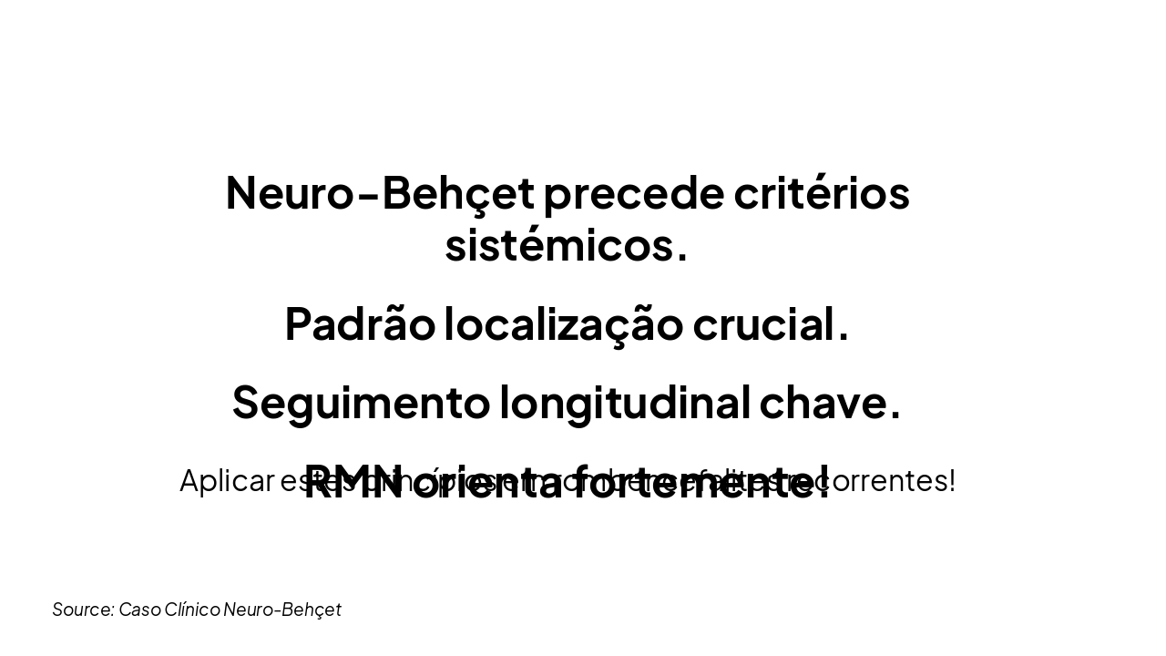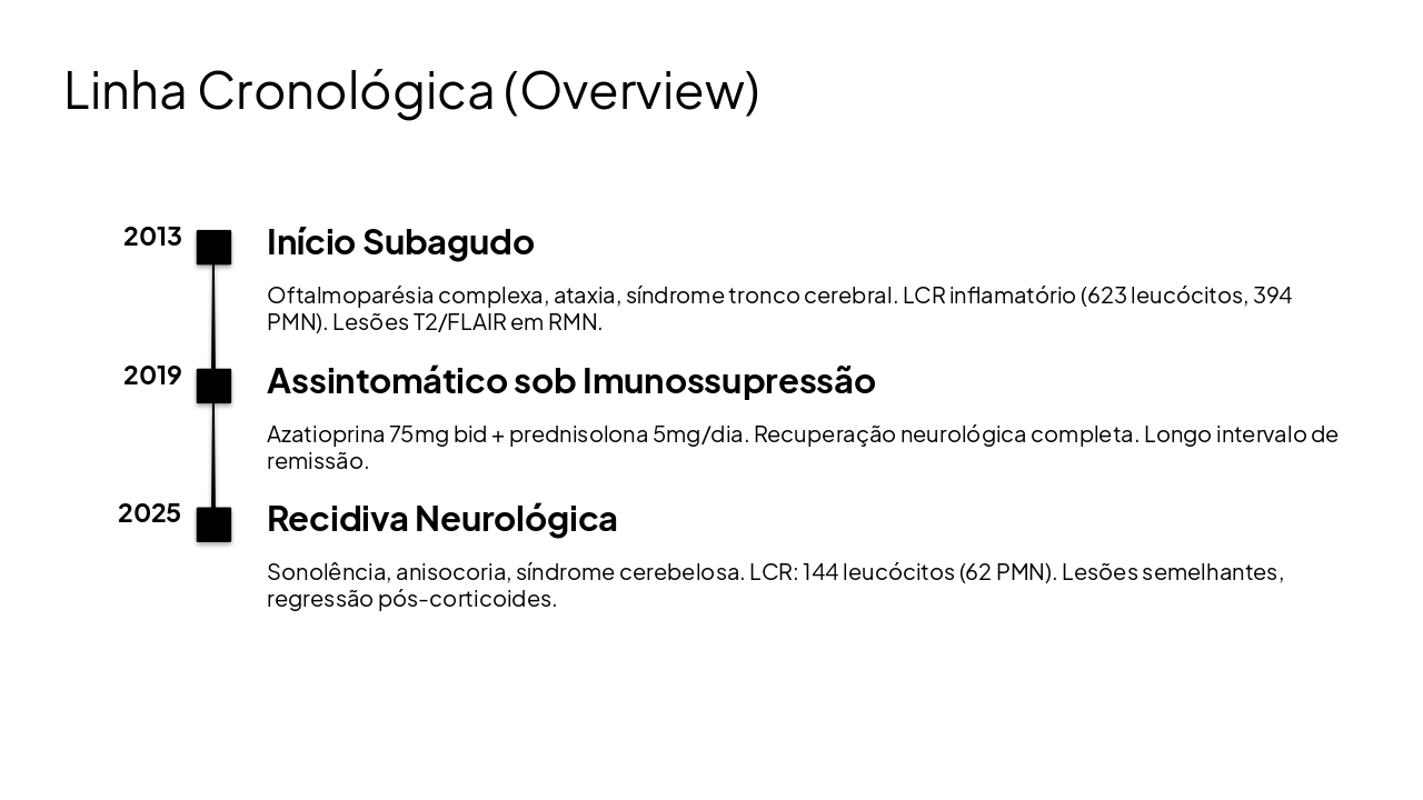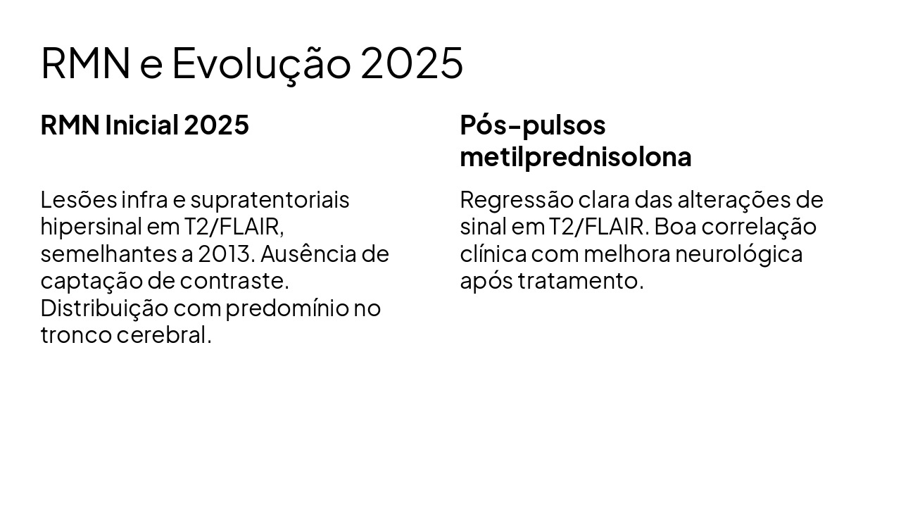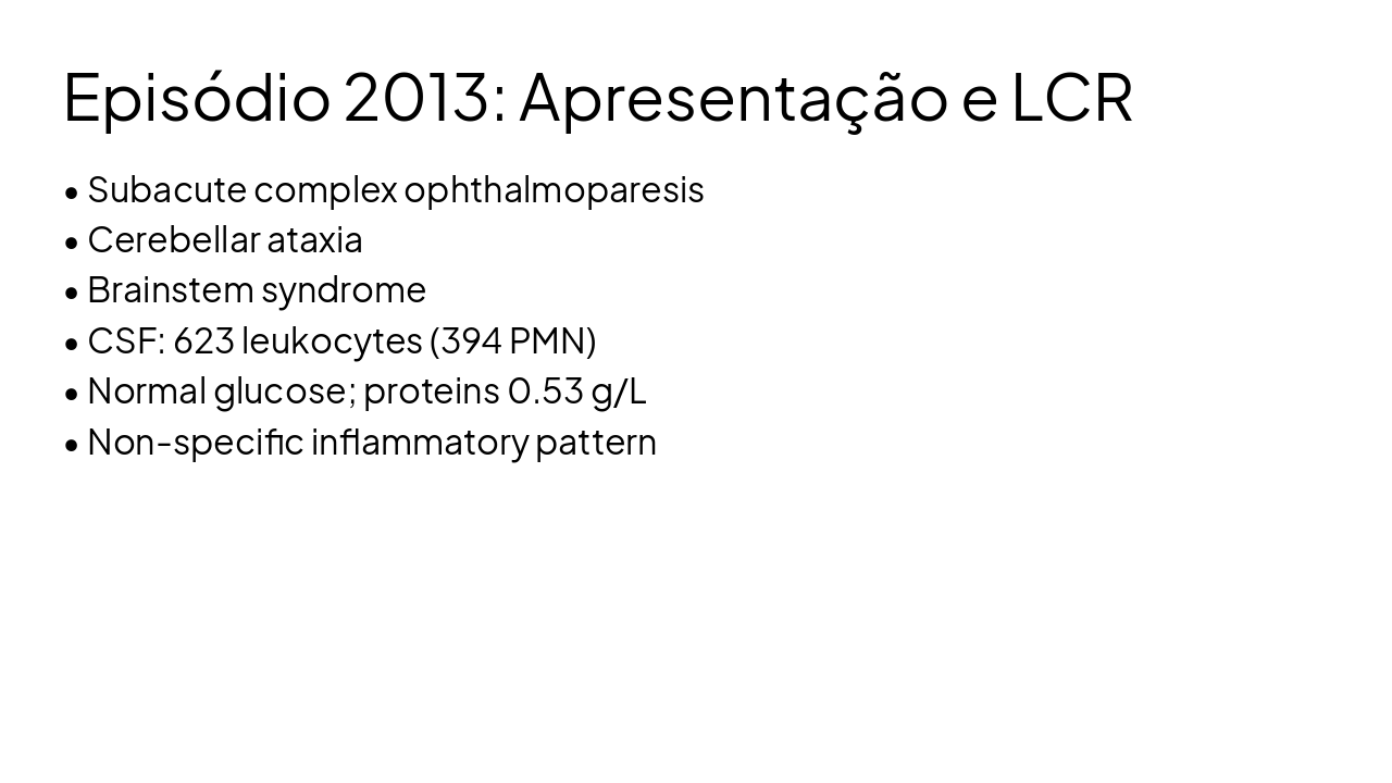 { "headers": [ "Entidade", "Porquê excluir?" ], "rows": [ [ "EM", "Lesões atípicas, sem OCB, tronco cerebral" ], [ "NMOSD", "AQP4 neg, sem NO/LETM/área postrema" ], [ "MOGAD", "MOG neg, sem lesões óptico-espinais" ], [ "Sarcoidose", "ECA normal, sem meningite, tórax normal" ], [ "Vasculites", "ANCAs neg, sem vasculite sistêmica" ], [ "Inflamatórias sistêmicas", "ANAs/SSA/SSB neg, sem sistêmicas" ], [ "Infeção crónica", "Sem agente, resposta a esteroides" ] ] }