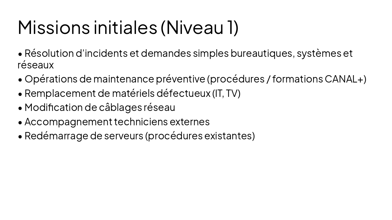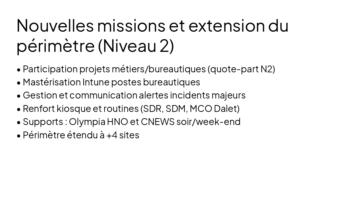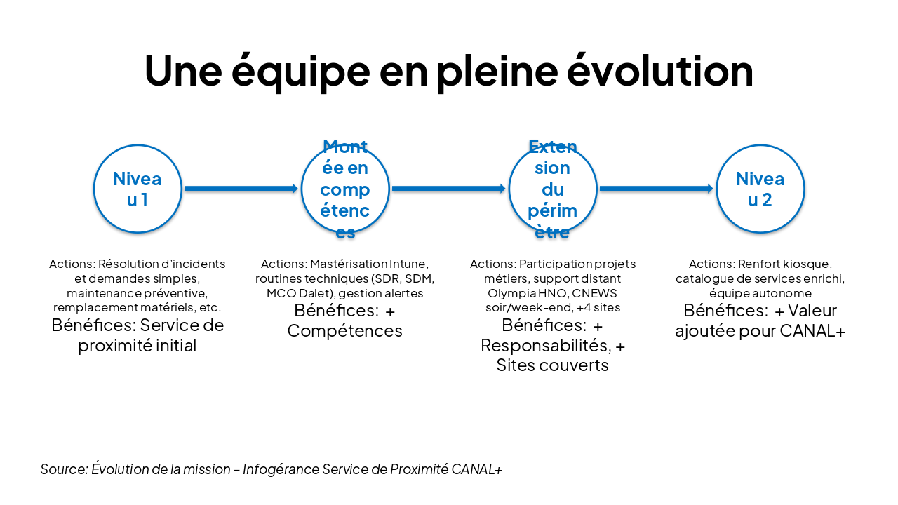 { "headers": [ "Étape", "Actions", "Bénéfices" ], "rows": [ [ "Niveau 1", "Résolution d’incidents et demandes simples, maintenance préventive, remplacement matériels, etc.", "Service de proximité initial" ], [ "Montée en compétences", "Mastérisation Intune, routines techniques (SDR, SDM, MCO Dalet), gestion alertes", " + Compétences" ], [ "Extension du périmètre", "Participation projets métiers, support distant Olympia HNO, CNEWS soir/week-end, +4 sites", " + Responsabilités, + Sites couverts" ], [ "Niveau 2", "Renfort kiosque, catalogue de services enrichi, équipe autonome", " + Valeur ajoutée pour CANAL+" ] ] }