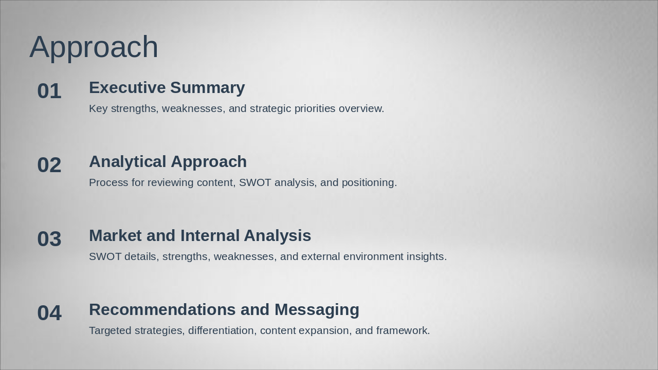 Steps: Review of website & content → SWOT & environment analysis → Positioning assessment & recommendations