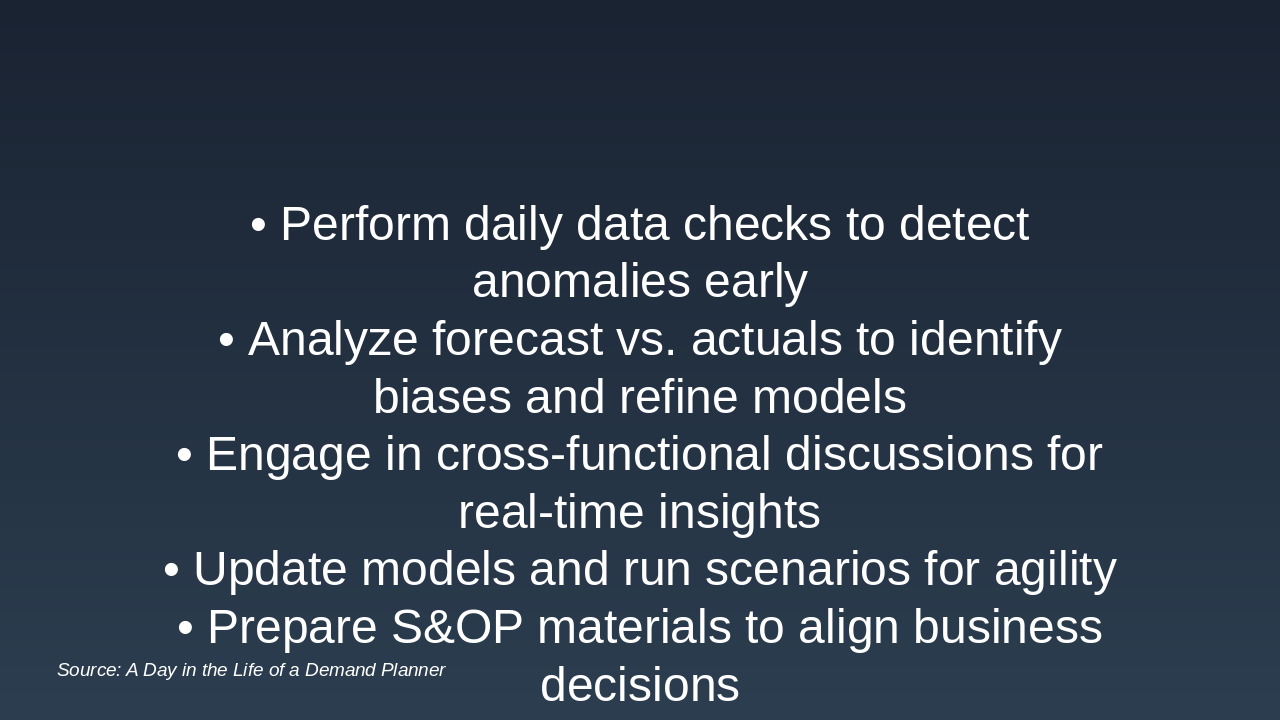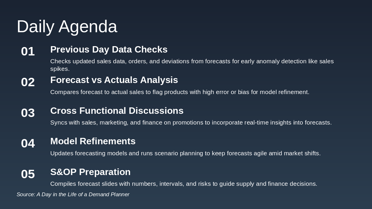 A demand planner's day ensures accurate forecasting through checks, analysis, collaboration, refinements, and prep—driving business alignment and agility.