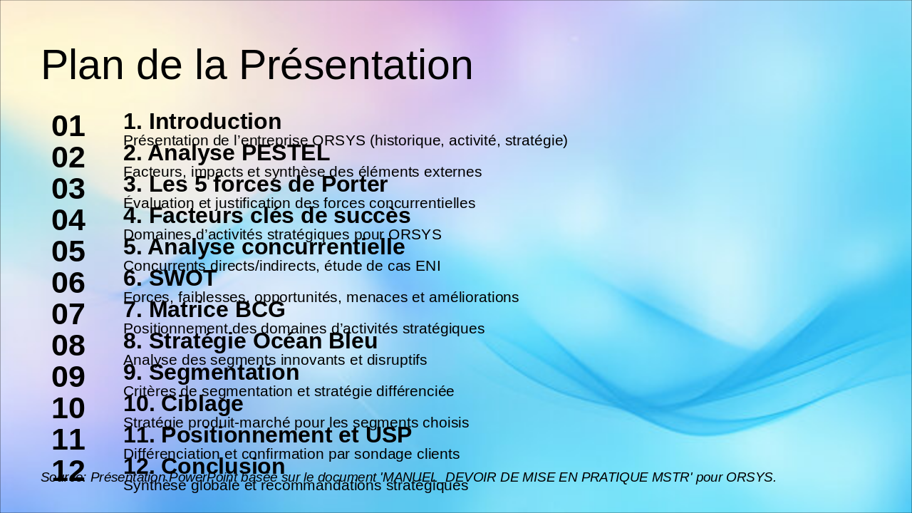 This presentation agenda outlines a strategic analysis of ORSYS, beginning with an introduction to the company's history, activities, and strategy, followed by external assessments like PESTEL analysis and Porter's Five Forces. It then covers internal evaluations including key success factors, SWOT, BCG matrix, and competitive analysis, concluding with marketing strategies such as Blue Ocean, segmentation, targeting, positioning, and overall recommendations.