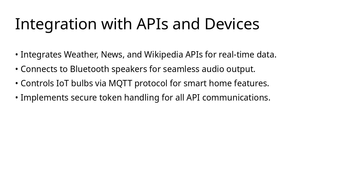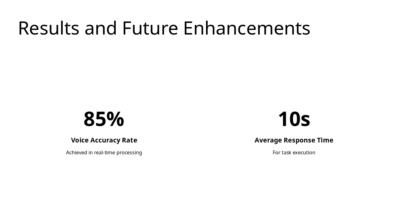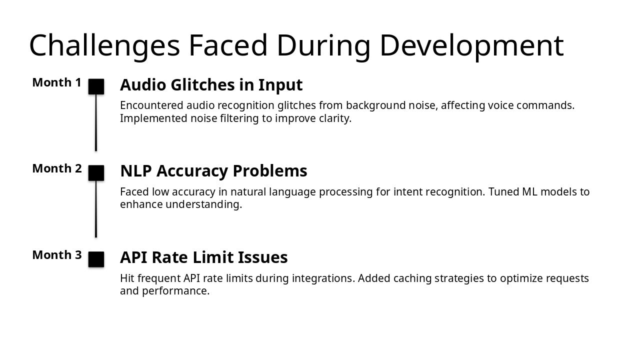 Month 1: Audio Glitches in Input Encountered audio recognition glitches from background noise, affecting voice commands. Implemented noise filtering to improve clarity. Month 2: NLP Accuracy Problems Faced low accuracy in natural language processing for intent recognition. Tuned ML models to enhance understanding. Month 3: API Rate Limit Issues Hit frequent API rate limits during integrations. Added caching strategies to optimize requests and performance.