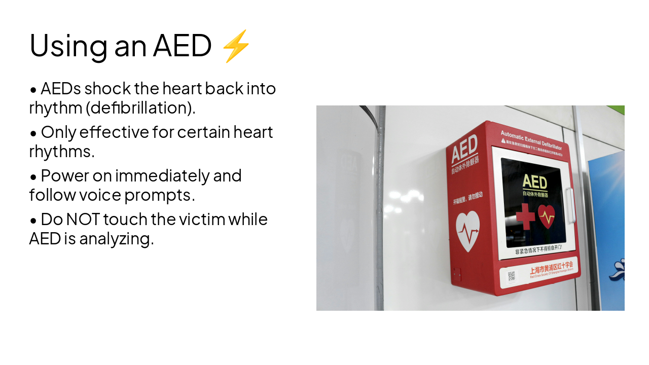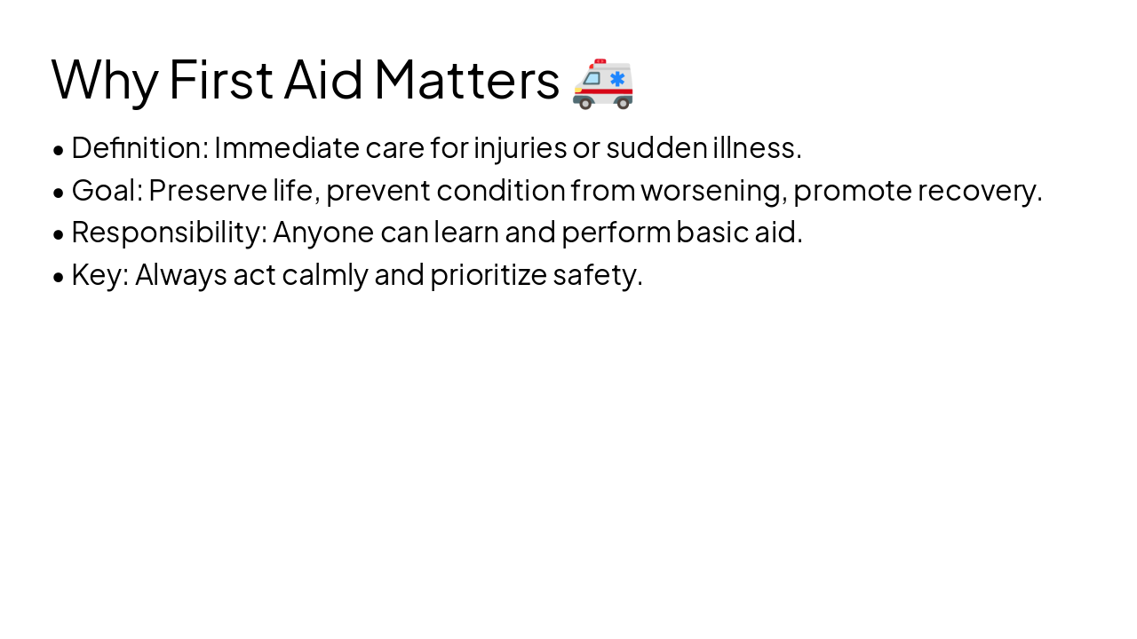 Create a professional presentation titled 'Basic First Aid and CPR Training'. Include around 12-15 slides with clear headings and bullet points. Cover: Introduction to First Aid, Importance of First Aid, Emergency Action Steps (DRABC), Checking Responsiveness, Calling Emergency Services, CPR Overview, Adult CPR Steps, Child and Infant CPR differences, Use of AED, Recovery Position, Treating Bleeding, Burns, Choking (Heimlich maneuver), Shock management, and Safety Tips. Include simple visuals/icons suggestions for each slide. Keep content concise and suitable for beginners.