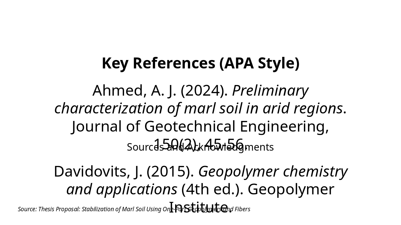 The slide lists key references in APA style on topics like marl soil characterization, geopolymer chemistry, clayey soil stabilization with industrial byproducts, and fiber-reinforced geopolymer-stabilized soils. It concludes with a thank-you message and an invitation for thoughts and questions.