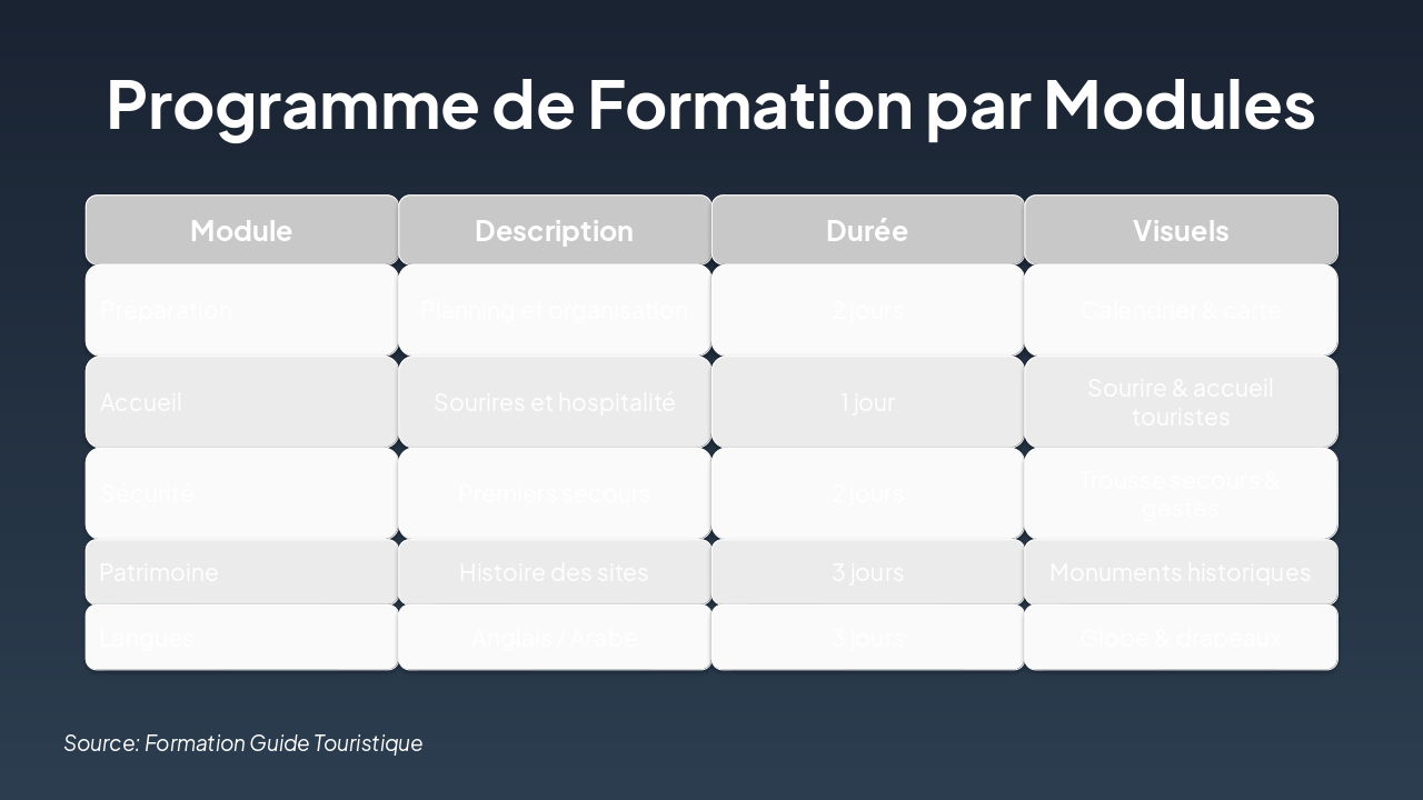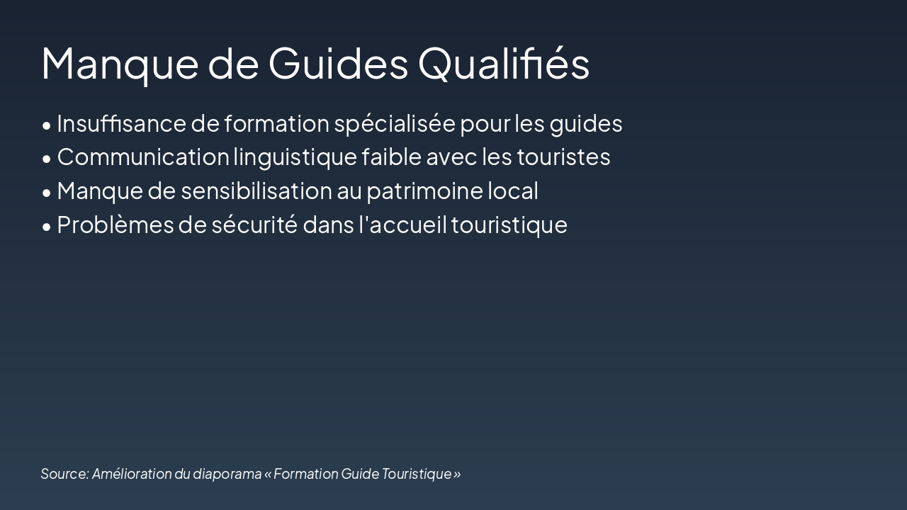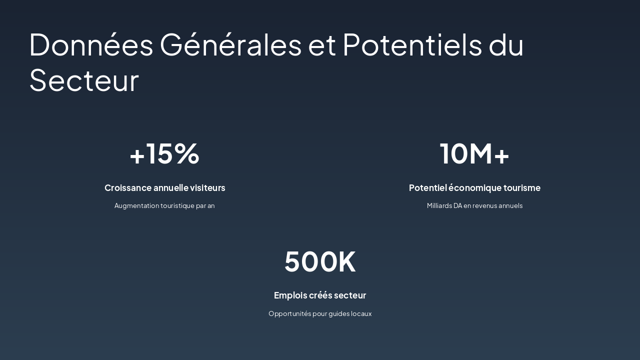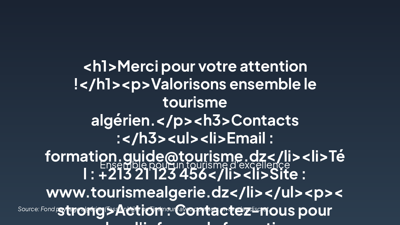 <h1>Merci pour votre attention !</h1><p>Valorisons ensemble le tourisme algérien.</p><h3>Contacts :</h3><ul><li>Email : formation.guide@tourisme.dz</li><li>Tél : +213 21 123 456</li><li>Site : www.tourismealgerie.dz</li></ul><p><strong>Action : Contactez-nous pour plus d'infos sur la formation !</strong></p>