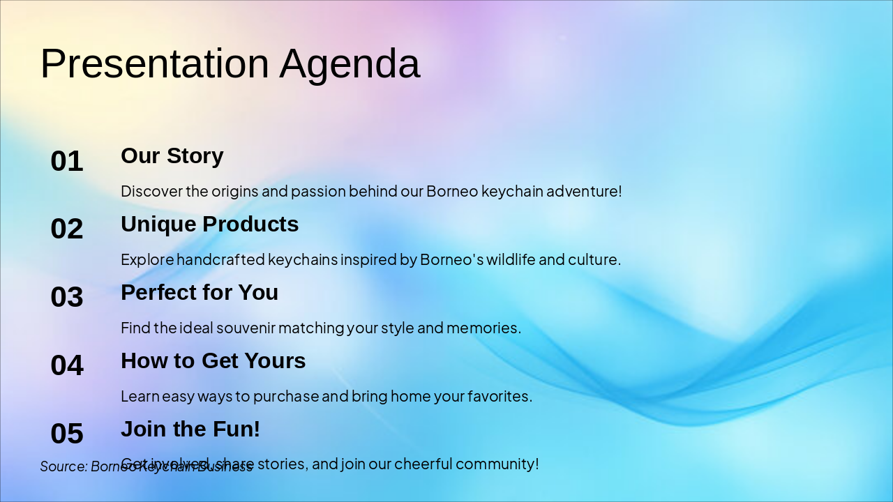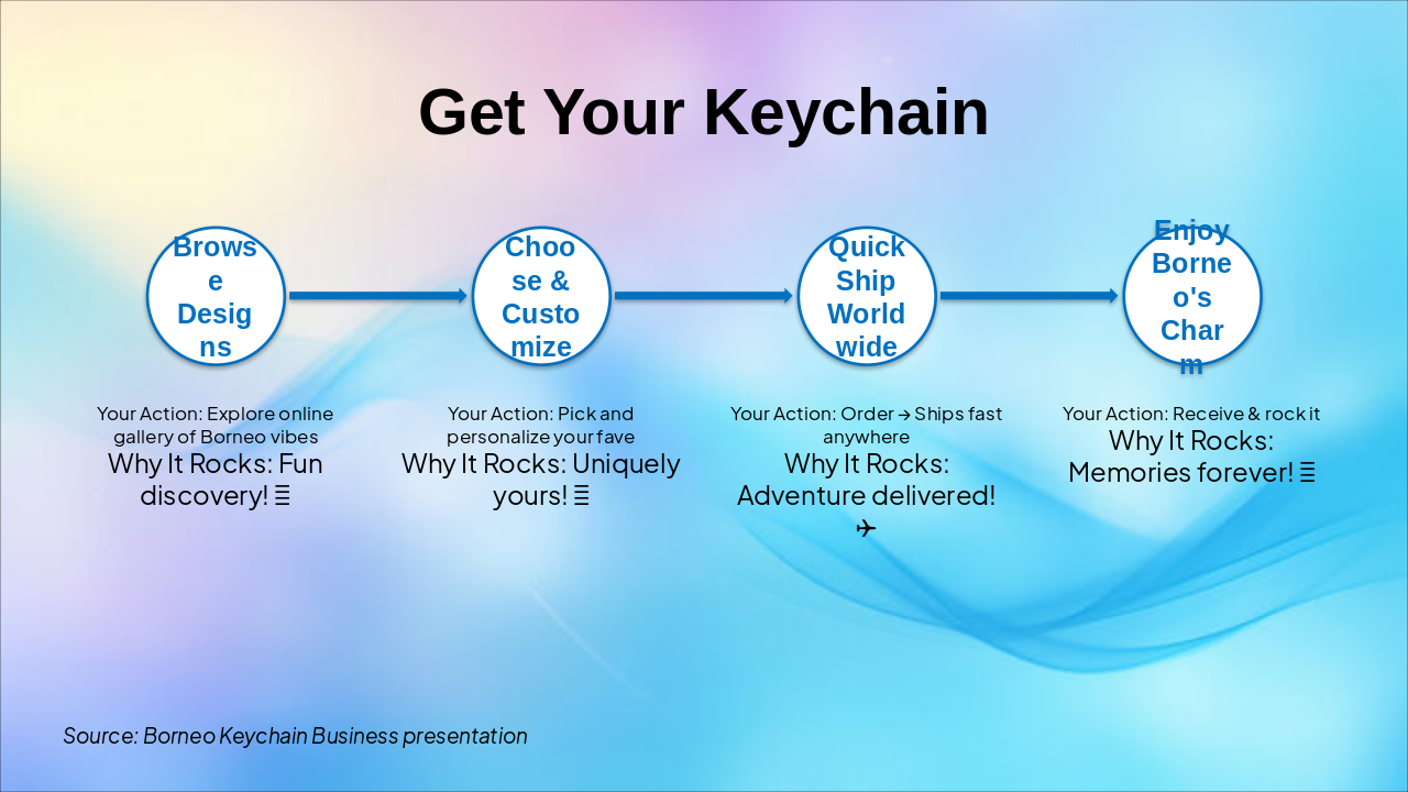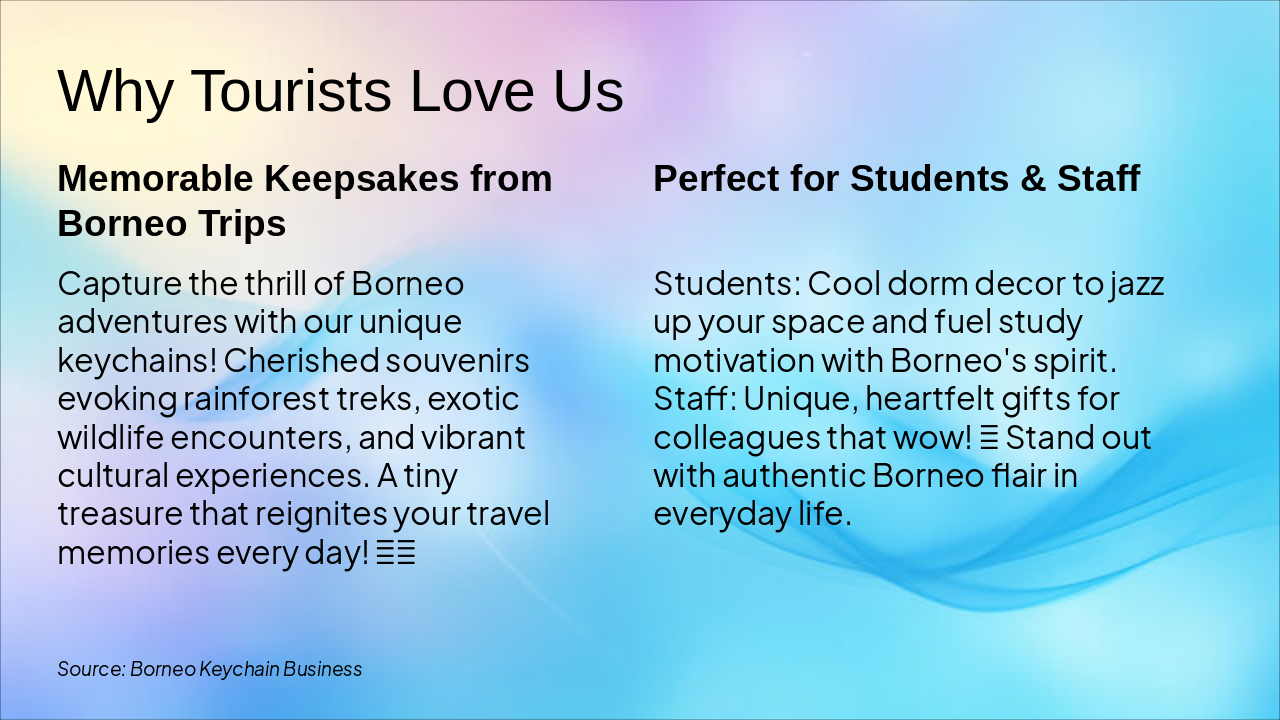 The Keychain Features slide presents a grid of six highlights: durable metal and Borneo wood, waterproof lightweight design, custom engraving, affordability from $5, eco-friendly materials, and vibrant local designs. These emphasize toughness, personalization, sustainability, and cultural appeal for everyday use.