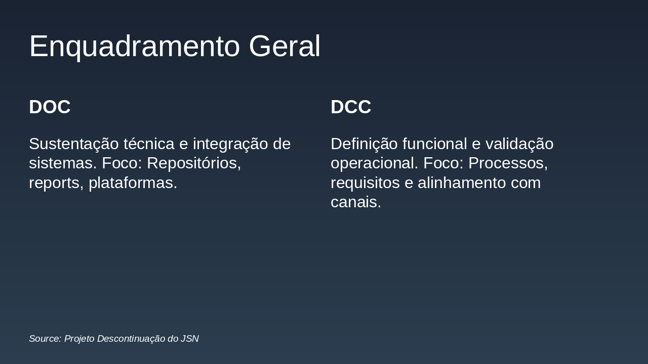 The slide "Enquadramento Geral" divides its content into two columns. The left column, titled "DOC," covers technical support and system integration, focusing on repositories, reports, and platforms. The right column, titled "DCC," addresses functional definition and operational validation, emphasizing processes, requirements, and alignment with channels.
