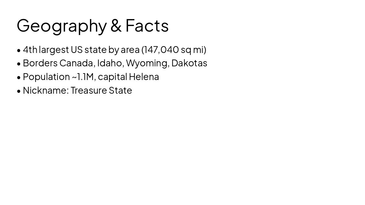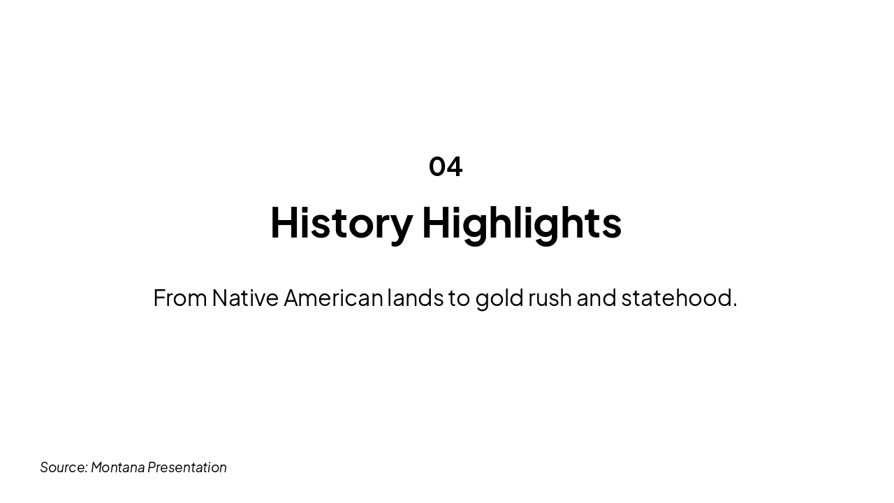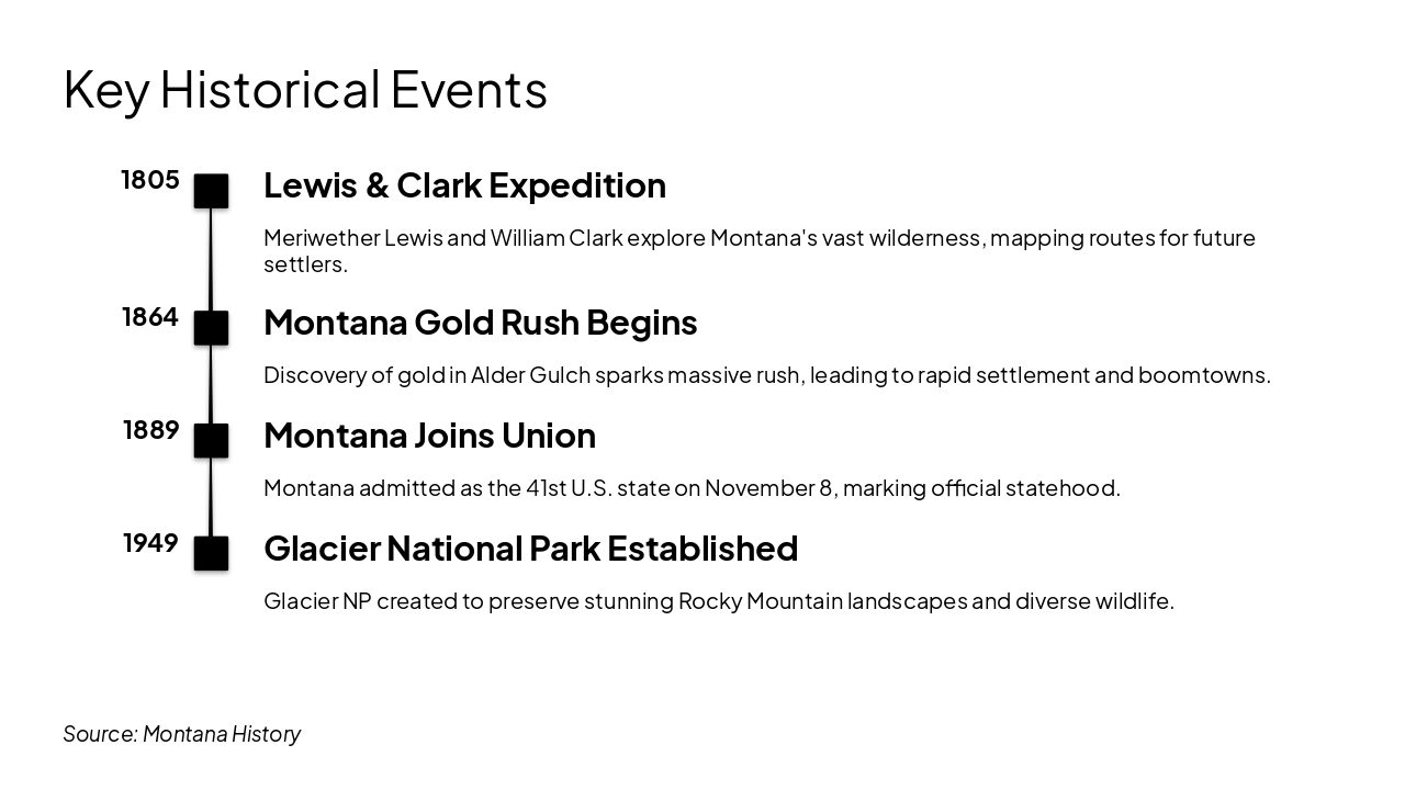 1805: Lewis & Clark Expedition Meriwether Lewis and William Clark explore Montana's vast wilderness, mapping routes for future settlers. 1864: Montana Gold Rush Begins Discovery of gold in Alder Gulch sparks massive rush, leading to rapid settlement and boomtowns. 1889: Montana Joins Union Montana admitted as the 41st U.S. state on November 8, marking official statehood. 1949: Glacier National Park Established Glacier NP created to preserve stunning Rocky Mountain landscapes and diverse wildlife.