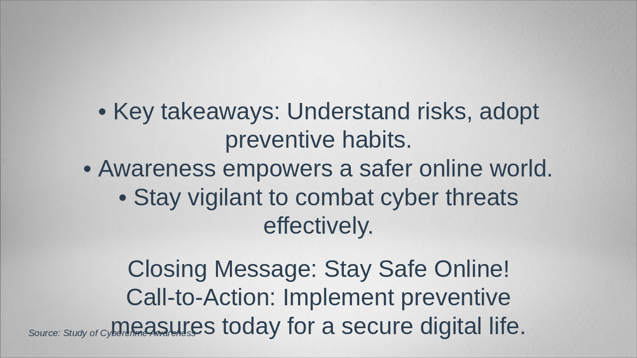 The conclusion slide highlights key takeaways, emphasizing the need to understand cyber risks, adopt preventive habits, and stay vigilant to combat threats, as awareness fosters a safer online world. It ends with a closing message to "Stay Safe Online!" and a call-to-action urging immediate implementation of preventive measures for a secure digital life.