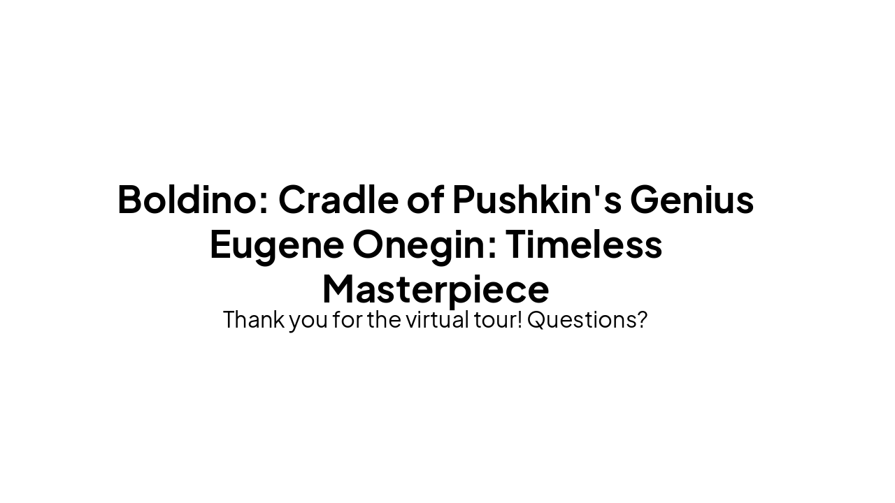 Virtual tour of Alexander Pushkin's Boldino Estate museum-reserve. Explore 'Boldino Autumn' creative surge, personal study, Eugene Onegin creation history, key moments (Lensky, Larins, rendezvous), and house rooms.
