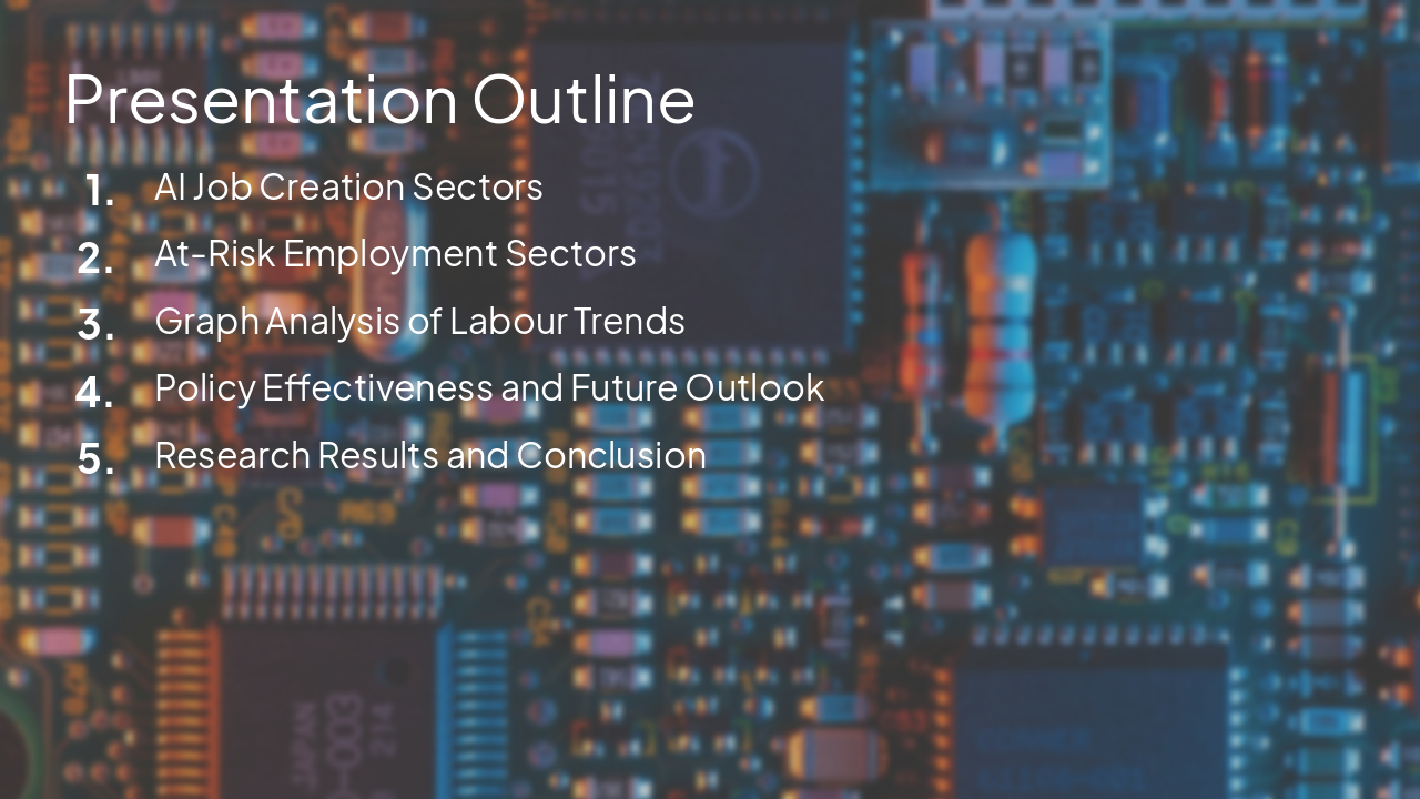 Enhance the visual design and formatting of a presentation titled 'How will AI impact the labour market in the UK, and how could the government regulate it to ensure positive employment practices?'. Keep the original content but improve layout, typography, consistency, and visual appeal. Use modern professional slides with clear section headers, icons, balanced spacing, and better bullet structuring. Include slides for: Title, Quote (Elon Musk), Research Question, Methodology, Outline, AI Job Creation Sectors, At-Risk Sectors, Graph Analysis, Policy Effectiveness, Results, Conclusion. Apply a clean academic style with subtle color palette (blue/white/grey), and add visual hierarchy and minimal text per slide.