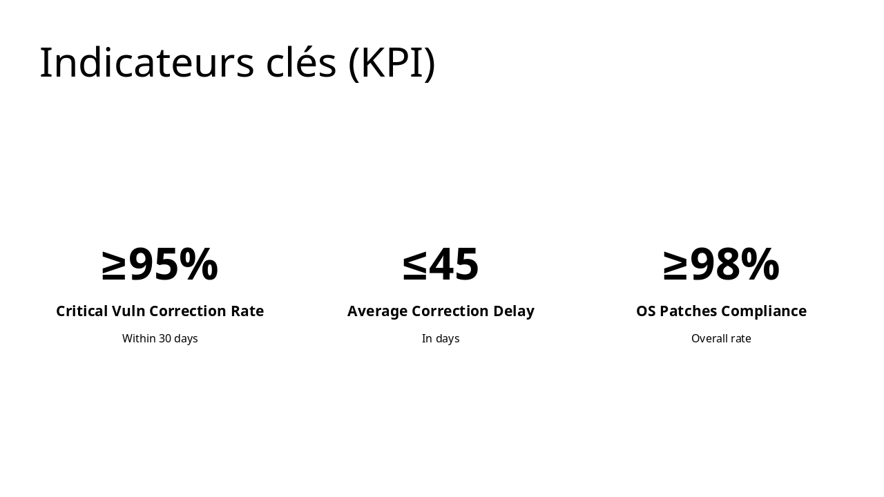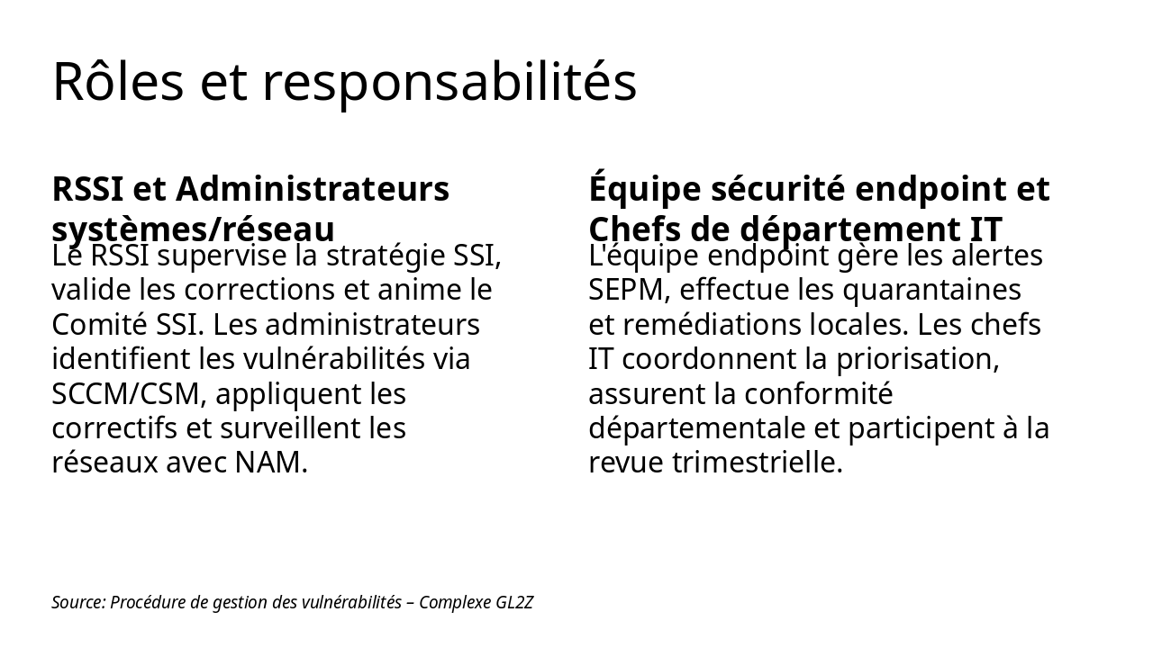 | Le RSSI supervise la stratégie SSI, valide les corrections et anime le Comité SSI. Les administrateurs identifient les vulnérabilités via SCCM/CSM, appliquent les correctifs et surveillent les réseaux avec NAM. | L'équipe endpoint gère les alertes SEPM, effectue les quarantaines et remédiations locales. Les chefs IT coordonnent la priorisation, assurent la conformité départementale et participent à la revue trimestrielle. |