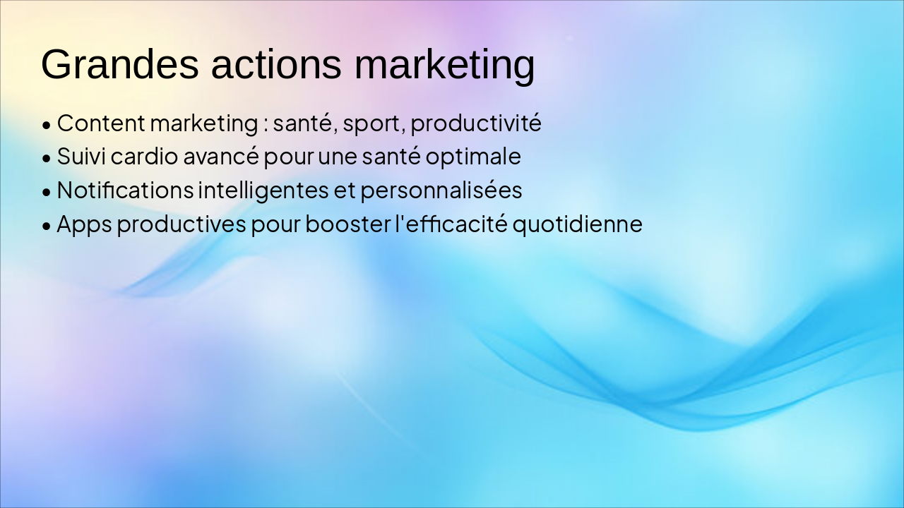 Slide 8 : Grandes actions marketing – content marketing centré sur la santé, le sport et la productivité, mise en avant des bénéfices et usages.