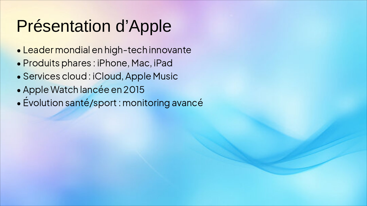 Slide 2 : Présentation d’Apple – entreprise, secteur, produits, services, historique de l’Apple Watch.