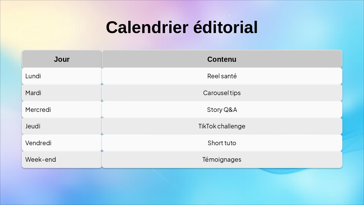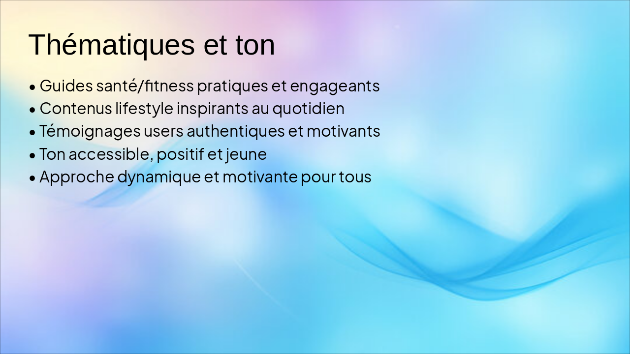 Slide 12 : Thématiques et ton – guides, santé, lifestyle, témoignages, ton accessible et positif.