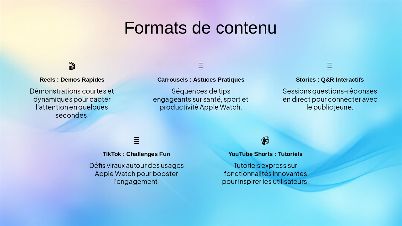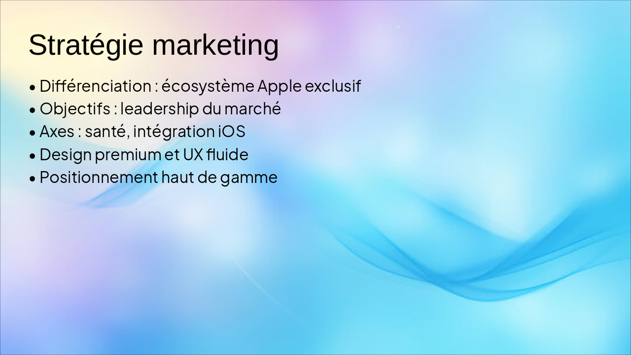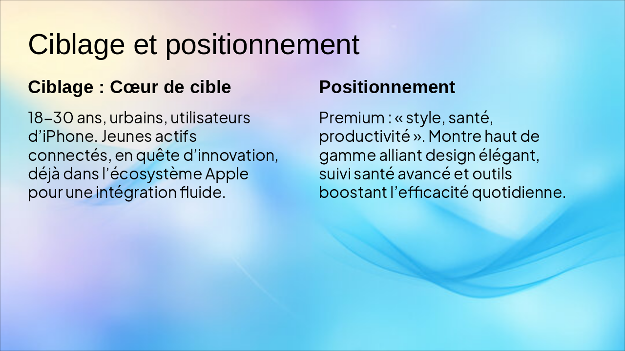 Slide 6 : Ciblage et positionnement – cœur de cible 18–30 ans, urbains, utilisateurs d’iPhone, positionnement premium « style, santé, productivité ».