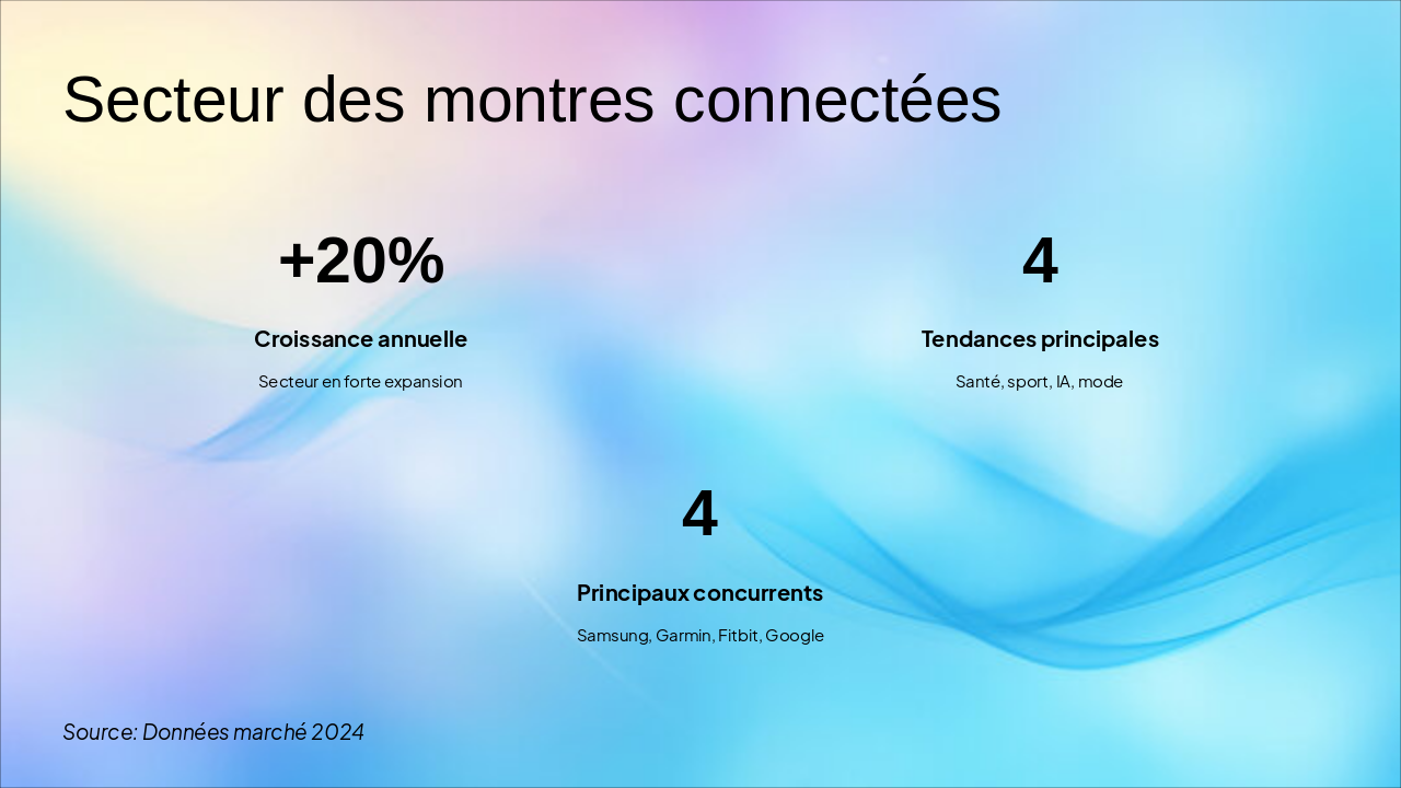Slide 3 : Secteur des montres connectées – croissance, tendances (santé, sport, IA, mode), principaux concurrents.