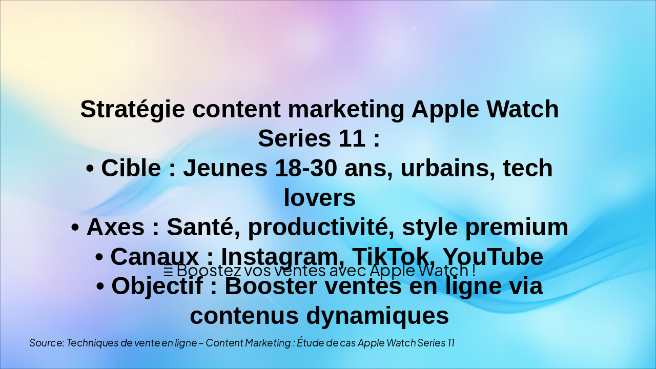 Présentation PowerPoint en français sur le thème : 'Techniques de vente en ligne – Content Marketing : Étude de cas Apple Watch Series 11'. Style : coloré, dynamique, jeune et moderne, inspiré de l'univers Apple. Contenu à inclure :