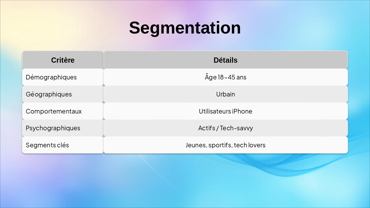 Slide 5 : Segmentation – critères (démographiques, géographiques, comportementaux, psychographiques), segments clés (jeunes, actifs, sportifs, tech lovers).