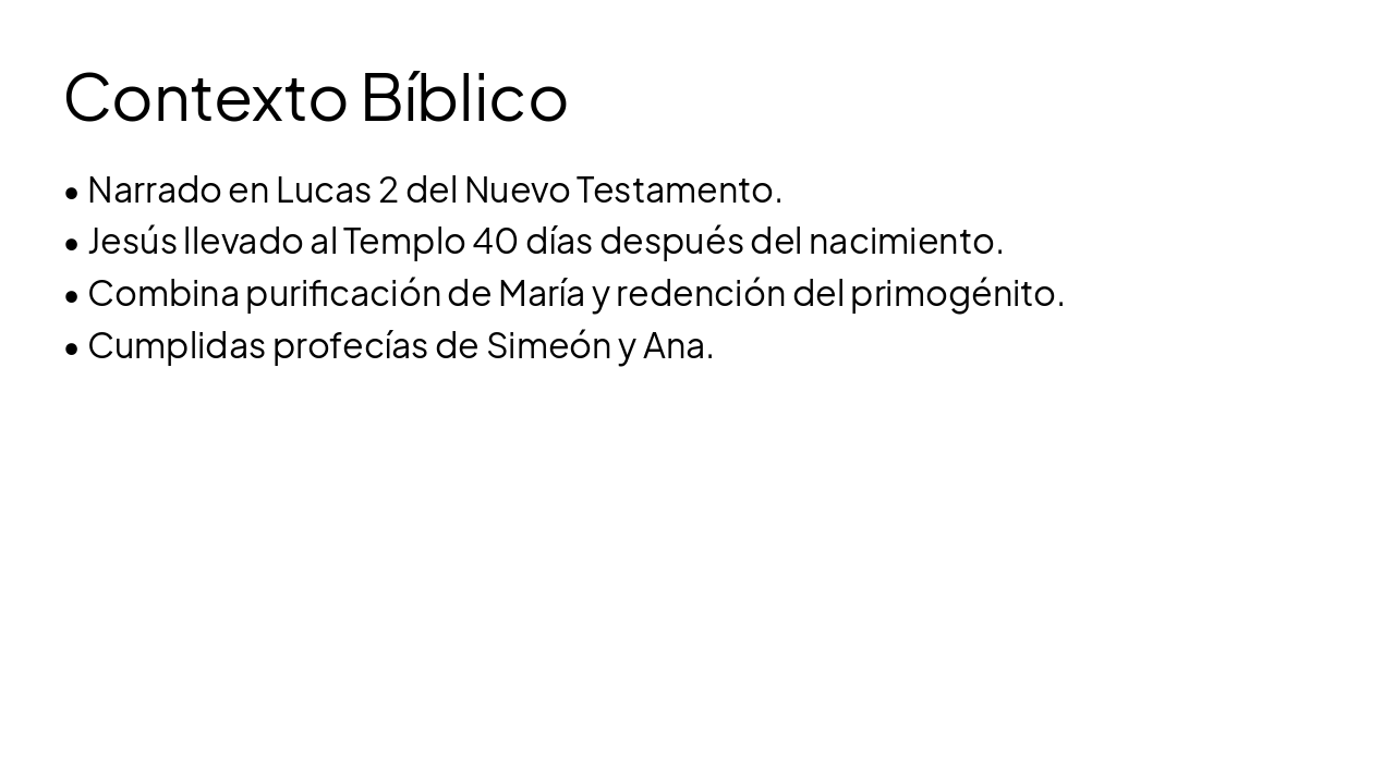 La diapositiva titulada "La Presentación de Jesús" es de tipo título y presenta este evento clave. Se describe como el episodio ocurrido 40 días después del nacimiento de Jesús en el Templo de Jerusalén.