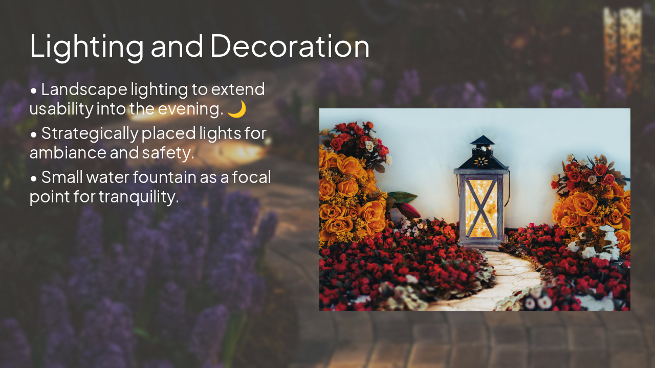 Slide 1 – Title Text: My Landscape Design Project A modern and comfortable outdoor space Design: • Background: modern garden / green yard photo • Style: minimal, clean, natural • White title in the center ⸻ Slide 2 – Idea / Concept Text: My idea is to create a small and cozy garden that is both beautiful and functional. It will include relaxation areas, plants, and decorative elements. Design: • Light background (white, beige, soft green) • Simple icons: 🌿 ☀️ 🪴 • Clean and minimal layout ⸻ Slide 3 – Zones of the Garden Text: The garden will include: • a patio for relaxation • a green lawn • flower beds • a walking path Design: • Simple garden layout / plan image • Green accents • Clear structure (like a map) ⸻ Slide 4 – Design Principles Text: The design follows basic principles: • Proportion • Balance • Repetition • Unity These principles create harmony and comfort. Design: • Minimal background • Each principle in a separate block • Small icons or lines for structure ⸻ Slide 5 – Plants and Structure Text: Plants will be arranged in layers: • tall plants in the back • medium plants in the middle • small flowers in the front This creates depth and harmony. Design: • Layered garden diagram or photo • Green gradient background • Vertical composition style ⸻ Slide 6 – Materials and Style Text: The design uses natural materials like wood and stone. Paths are made of pavers. The style is modern with clean lines. Design: • Photos of wood, stone, and paving • Modern / architectural style • Neutral and natural colors ⸻ Slide 7 – Lighting and Decoration Text: Landscape lighting highlights the garden at night. A small fountain adds a peaceful atmosphere. Design: • Night garden background 🌙 • Warm yellow lights • Fountain or glowing path image ⸻ Slide 8 – Conclusion Text: This project creates a peaceful and beautiful outdoor space for relaxation, combining nature, comfort, and design. Design: • Calm green garden photo • Minimal text • Big elegant title