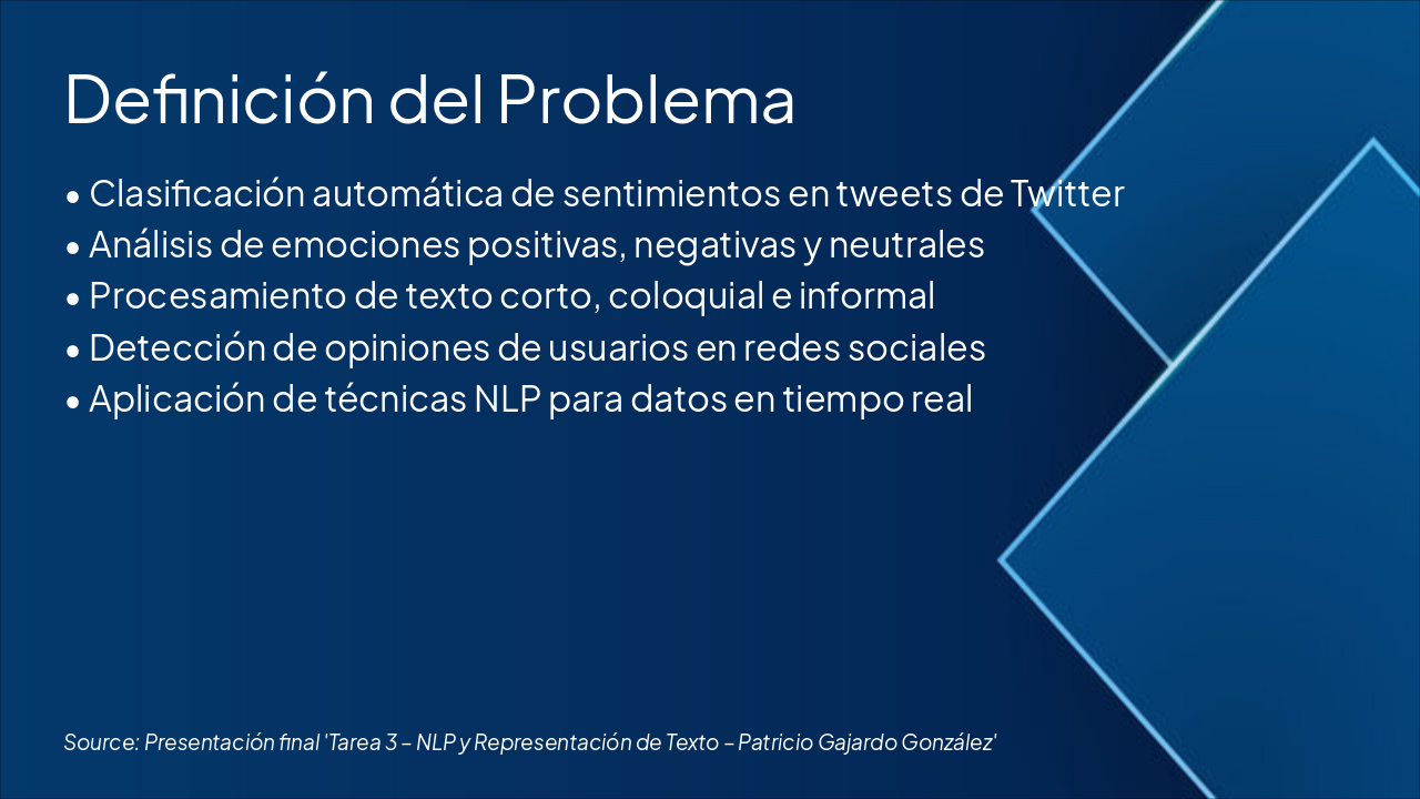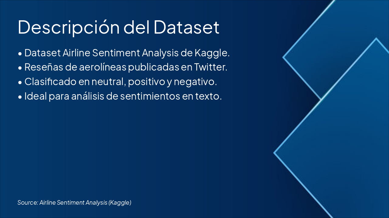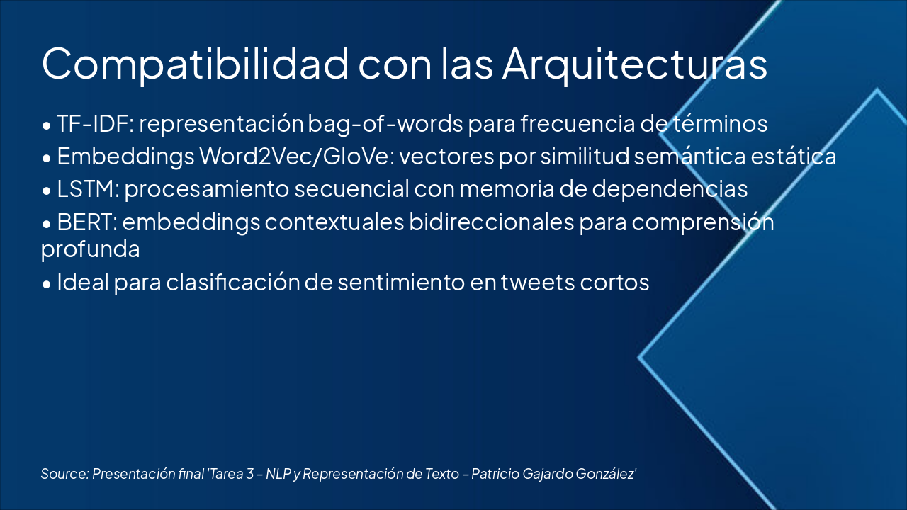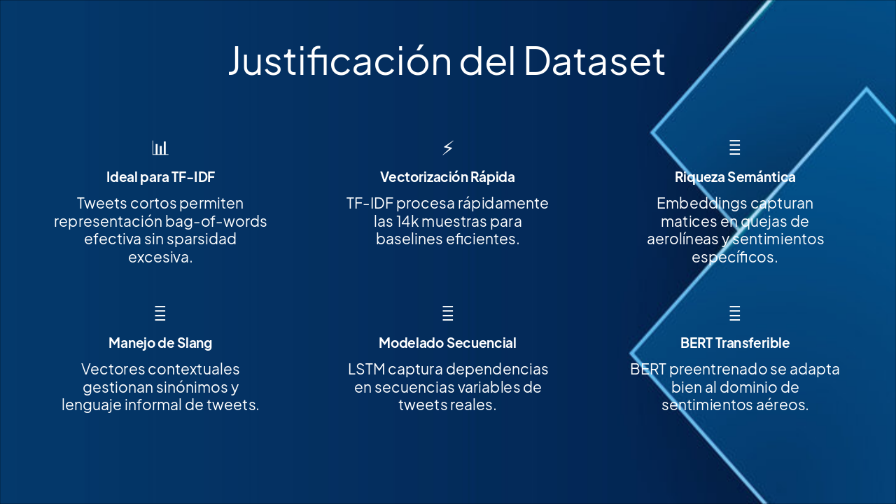 { "features": [ { "icon": "📊", "heading": "Ideal para TF-IDF", "description": "Tweets cortos permiten representación bag-of-words efectiva sin sparsidad excesiva." }, { "icon": "⚡", "heading": "Vectorización Rápida", "description": "TF-IDF procesa rápidamente las 14k muestras para baselines eficientes." }, { "icon": "🔗", "heading": "Riqueza Semántica", "description": "Embeddings capturan matices en quejas de aerolíneas y sentimientos específicos." }, { "icon": "🌐", "heading": "Manejo de Slang", "description": "Vectores contextuales gestionan sinónimos y lenguaje informal de tweets." }, { "icon": "🧠", "heading": "Modelado Secuencial", "description": "LSTM captura dependencias en secuencias variables de tweets reales." }, { "icon": "🤖", "heading": "BERT Transferible", "description": "BERT preentrenado se adapta bien al dominio de sentimientos aéreos." } ] }