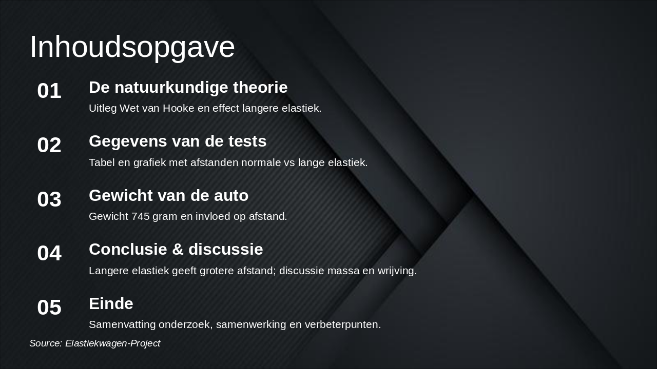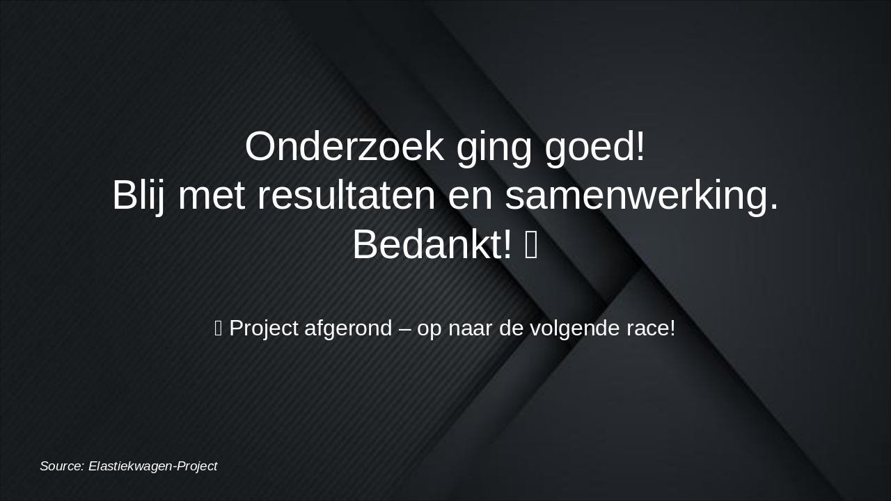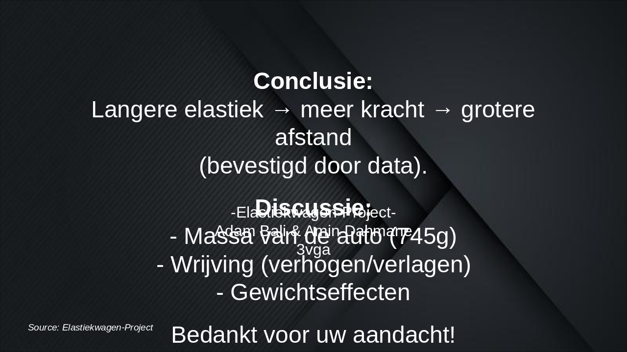 Samenvatting: Langere elastiek gaf meer kracht en grotere afstand, bevestigd door data. Bespreek massa, wrijving en gewichtseffecten kort. Eindig met bedankje.