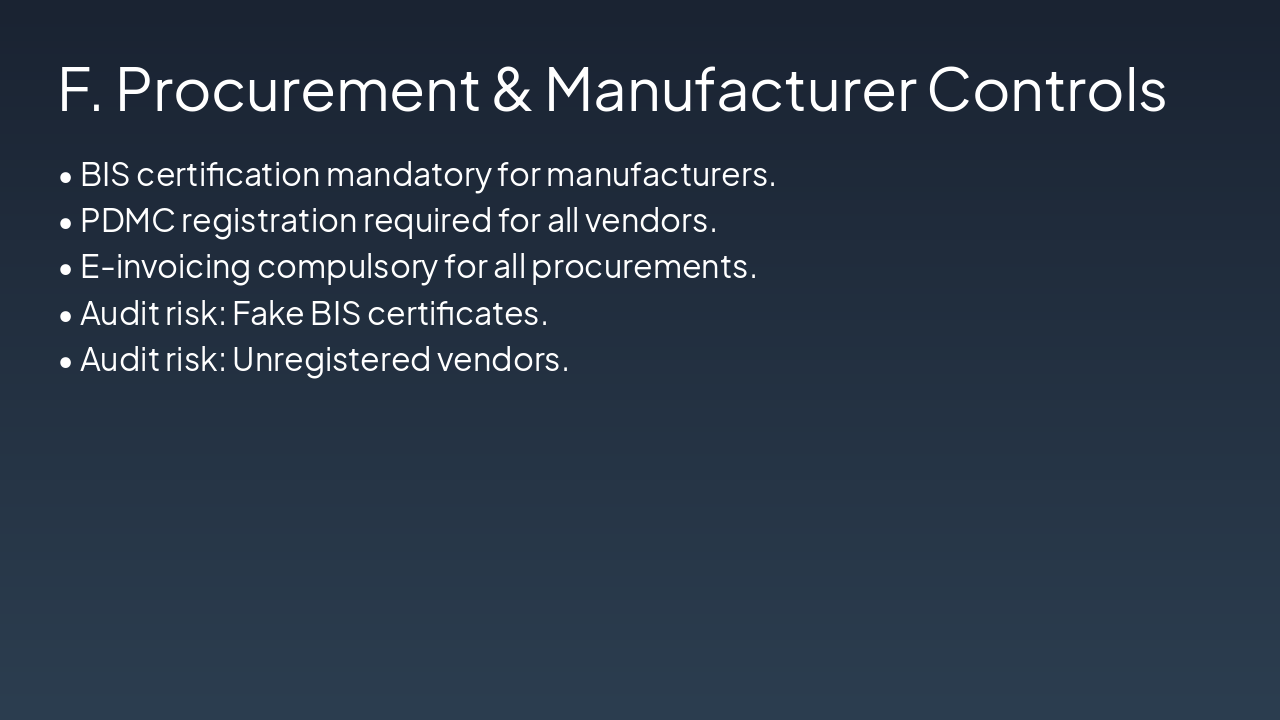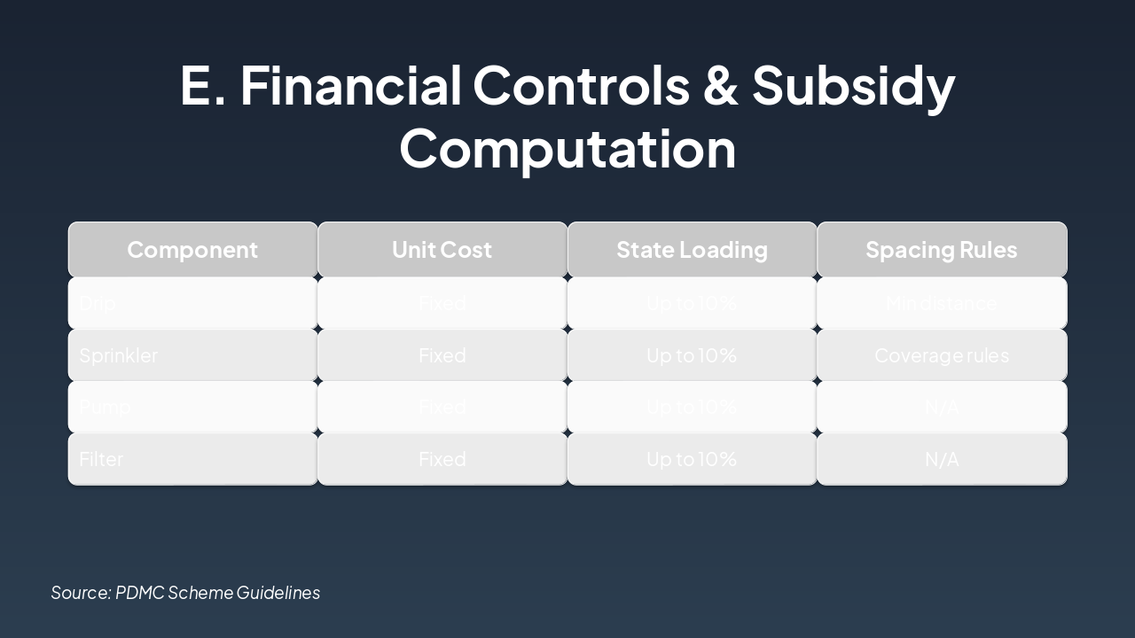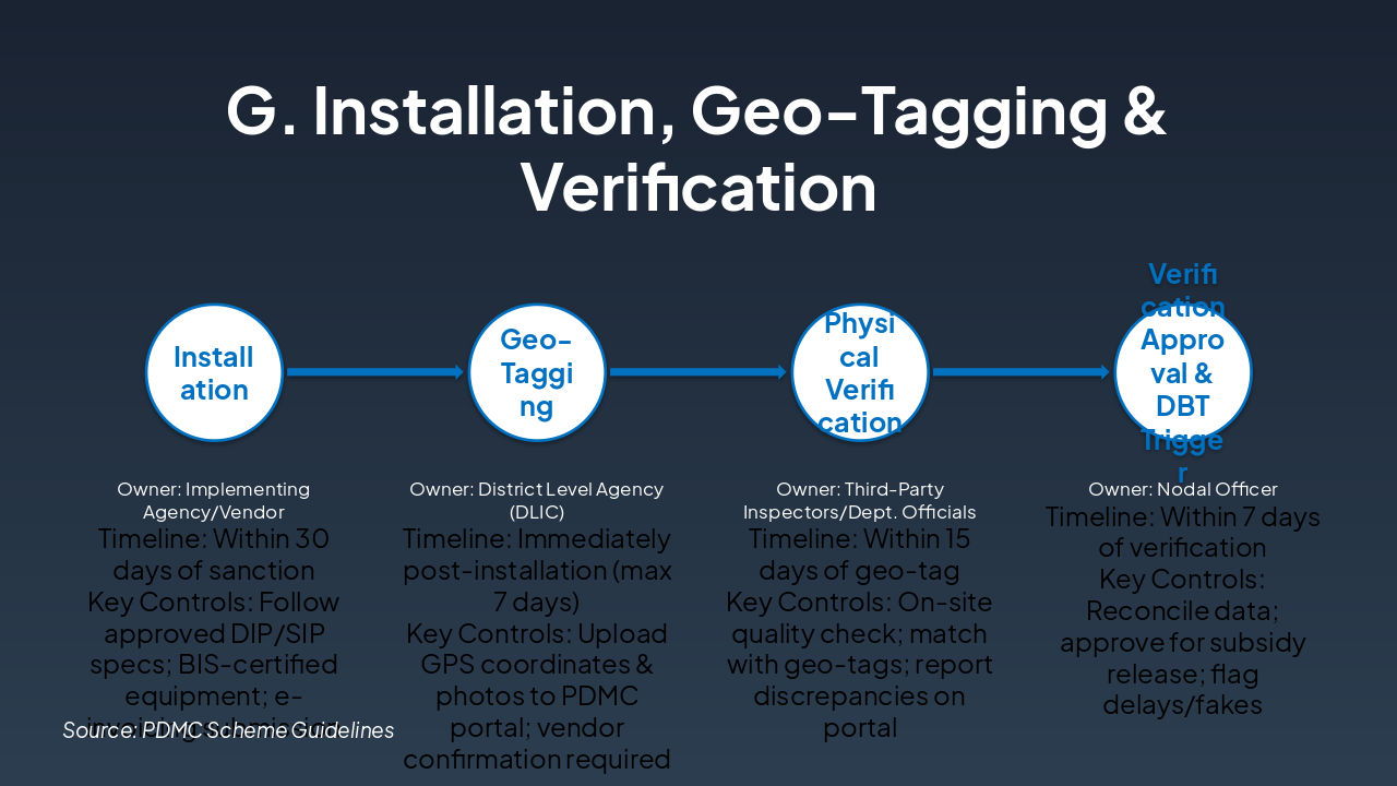 { "headers": [ "Step", "Owner", "Timeline", "Key Controls" ], "rows": [ [ "Installation", "Implementing Agency/Vendor", "Within 30 days of sanction", "Follow approved DIP/SIP specs; BIS-certified equipment; e-invoicing submission" ], [ "Geo-Tagging", "District Level Agency (DLIC)", "Immediately post-installation (max 7 days)", "Upload GPS coordinates & photos to PDMC portal; vendor confirmation required" ], [ "Physical Verification", "Third-Party Inspectors/Dept. Officials", "Within 15 days of geo-tag", "On-site quality check; match with geo-tags; report discrepancies on portal" ], [ "Verification Approval & DBT Trigger", "Nodal Officer", "Within 7 days of verification", "Reconcile data; approve for subsidy release; flag delays/fakes" ] ] }