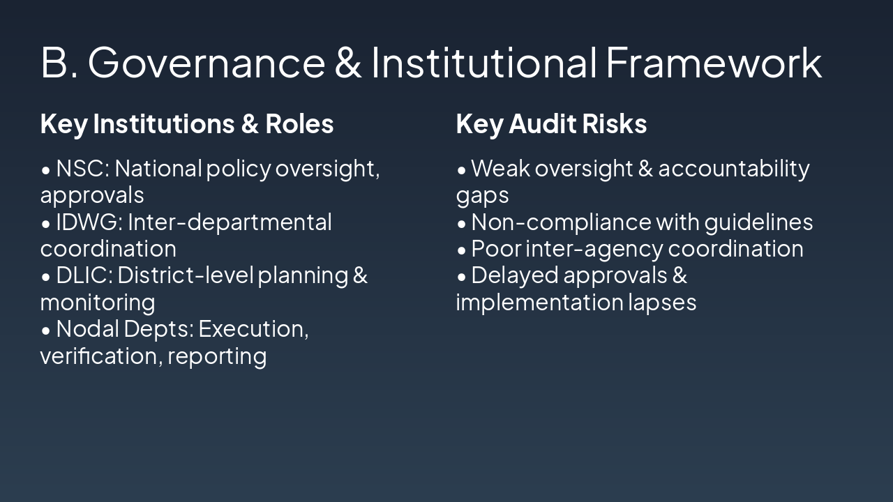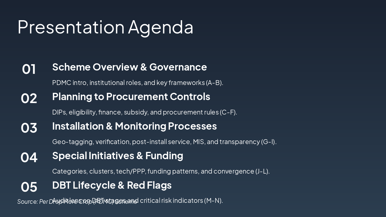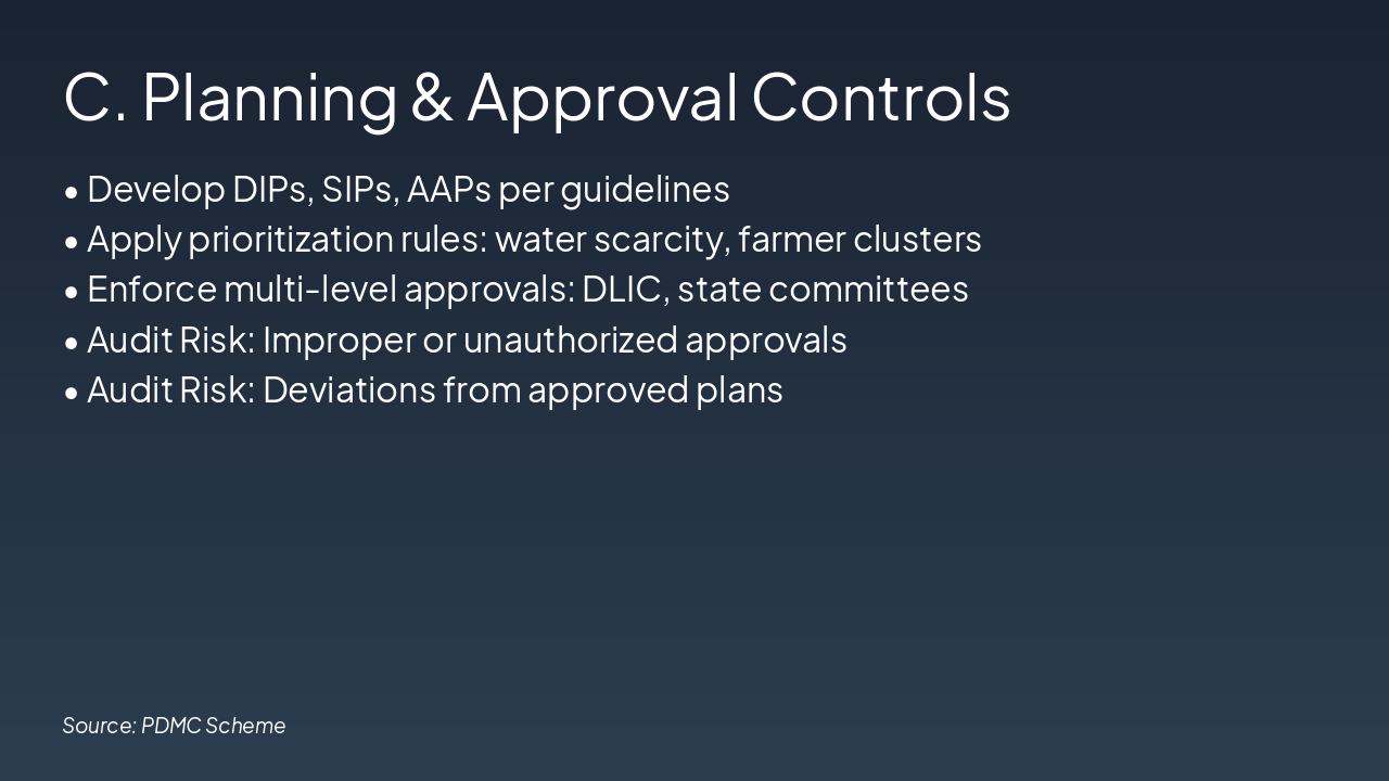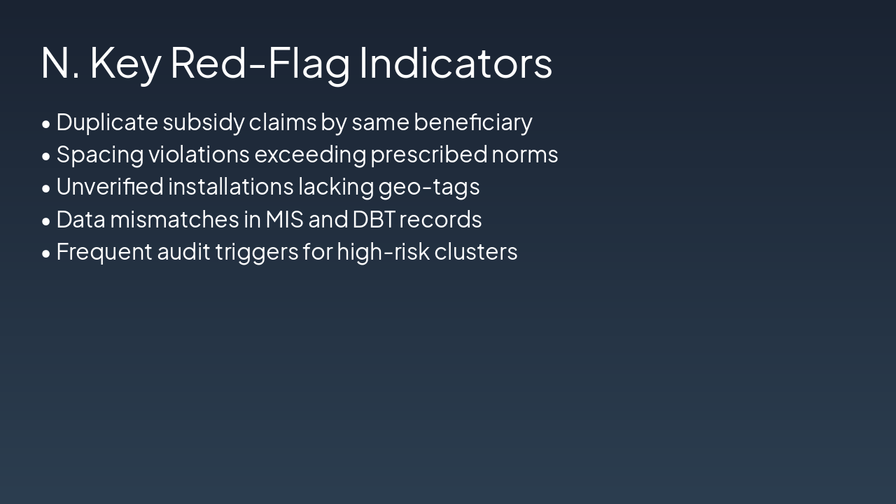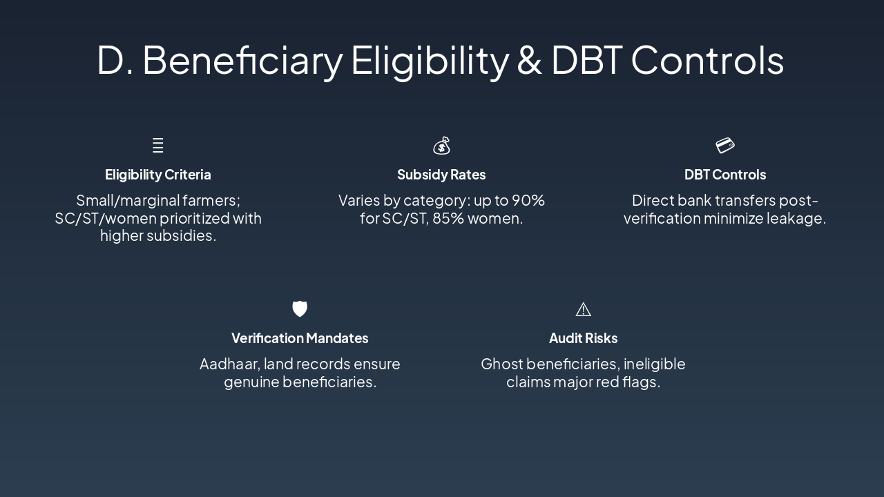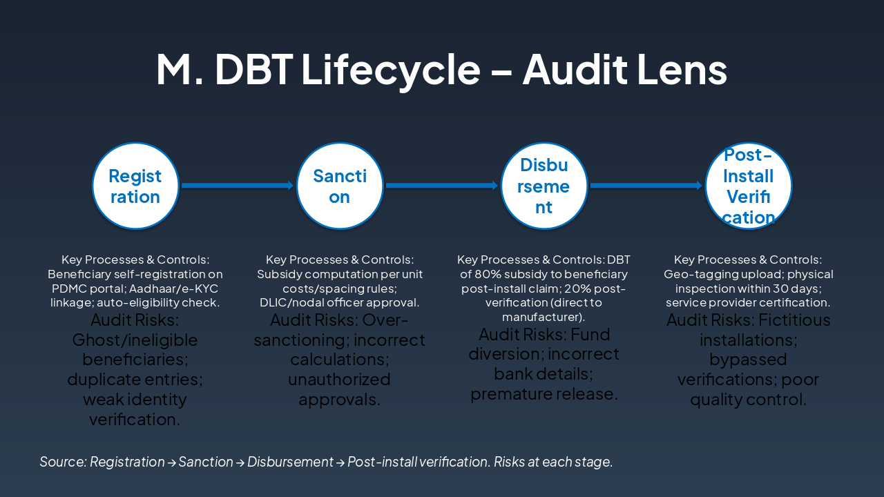 Steps: Install → Geo-tag → Physical verify within timelines. Audit risks: Delayed verification, fake tags. Ensures micro-irrigation systems are installed correctly, geo-tagged on portal, and verified physically to prevent fraud and delays.