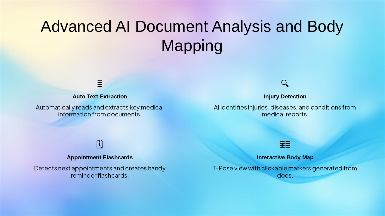 { "features": [ { "icon": "š", "heading": "Auto Text Extraction", "description": "Automatically reads and extracts key medical information from documents." }, { "icon": "š", "heading": "Injury Detection", "description": "AI identifies injuries, diseases, and conditions from medical reports." }, { "icon": "šļø", "heading": "Appointment Flashcards", "description": "Detects next appointments and creates handy reminder flashcards." }, { "icon": "š§āāļø", "heading": "Interactive Body Map", "description": "T-Pose view with clickable markers generated from docs." } ] }