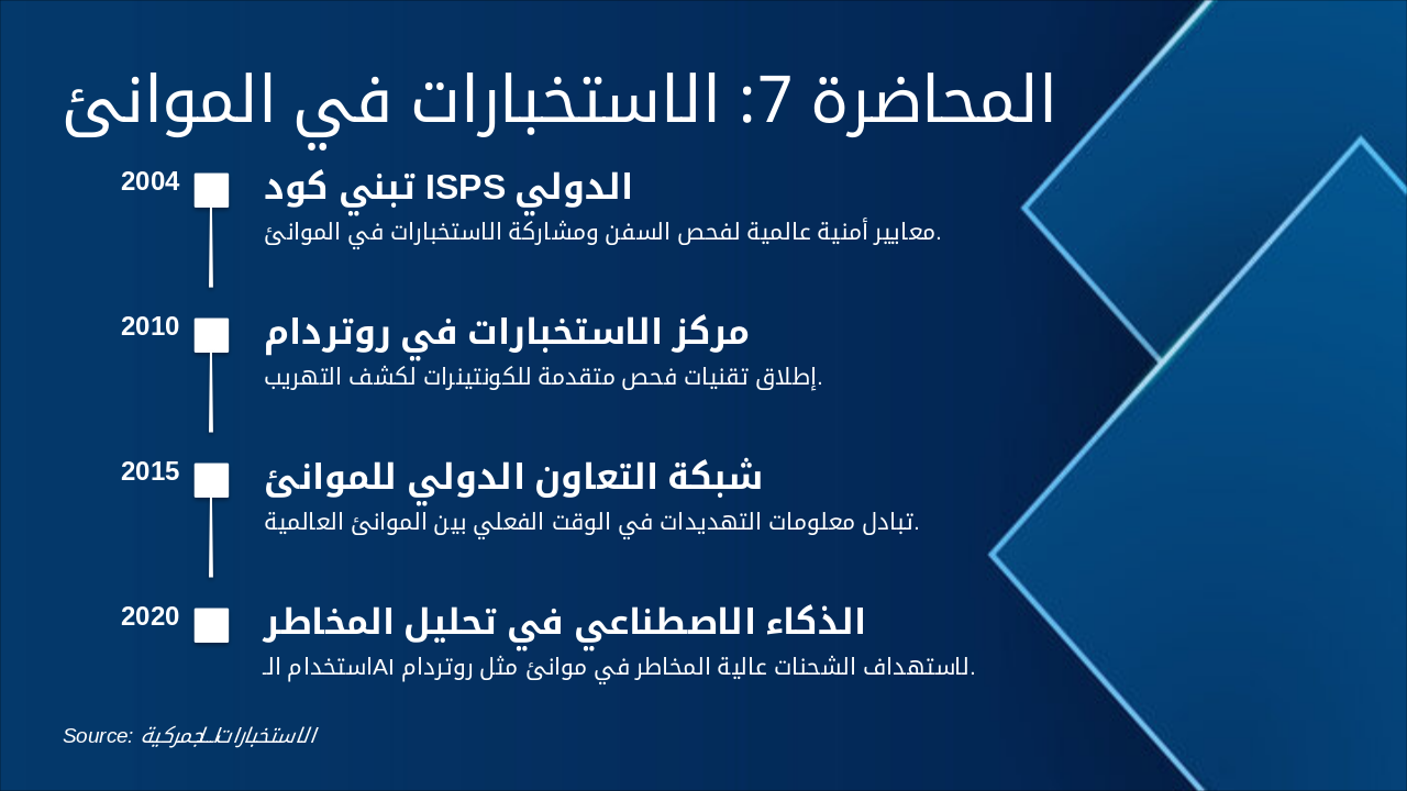 2004: تبني كود ISPS الدولي معايير أمنية عالمية لفحص السفن ومشاركة الاستخبارات في الموانئ. 2010: مركز الاستخبارات في روتردام إطلاق تقنيات فحص متقدمة للكونتينرات لكشف التهريب. 2015: شبكة التعاون الدولي للموانئ تبادل معلومات التهديدات في الوقت الفعلي بين الموانئ العالمية. 2020: الذكاء الاصطناعي في تحليل المخاطر استخدام الـAI لاستهداف الشحنات عالية المخاطر في موانئ مثل روتردام.