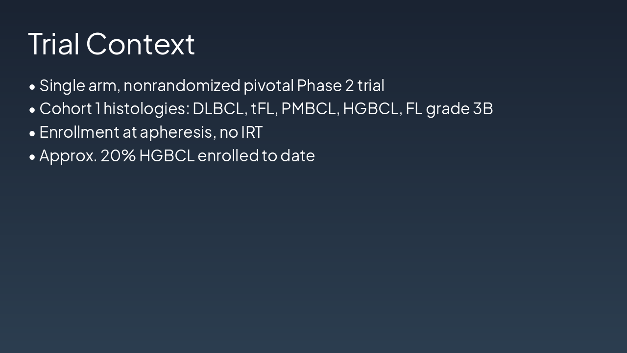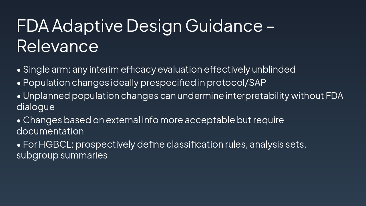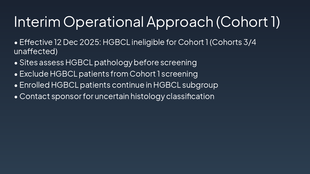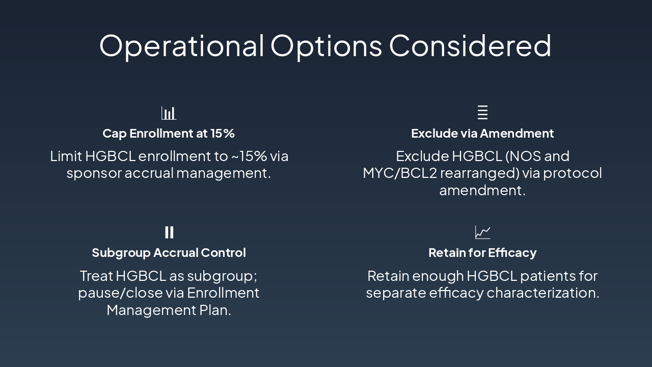 { "features": [ { "icon": "📊", "heading": "Cap Enrollment at 15%", "description": "Limit HGBCL enrollment to ~15% via sponsor accrual management." }, { "icon": "❌", "heading": "Exclude via Amendment", "description": "Exclude HGBCL (NOS and MYC/BCL2 rearranged) via protocol amendment." }, { "icon": "⏸️", "heading": "Subgroup Accrual Control", "description": "Treat HGBCL as subgroup; pause/close via Enrollment Management Plan." }, { "icon": "📈", "heading": "Retain for Efficacy", "description": "Retain enough HGBCL patients for separate efficacy characterization." } ] }