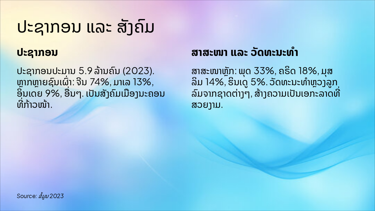 | ປະຊາກອນປະມານ 5.9 ລ້ານຄົນ (2023). ຫຼາກຫຼາຍຊົນເຜົ່າ: ຈີນ 74%, ມາເລ 13%, ອິນເດຍ 9%, ອື່ນໆ. ເປັນສັງຄົມເມືອງນະຄອນທີ່ກ້າວໜ້າ. | ສາສະໜາຫຼັກ: ພຸດ 33%, ຄຣິດ 18%, ມຸສລິມ 14%, ຮິນເດູ 5%. ວັດທະນະທຳຫຼວງລູກລົມຈາກຊາດຕ່າງໆ, ສ້າງຄວາມເປັນເອກະລາດທີ່ສວຍງາມ. |
